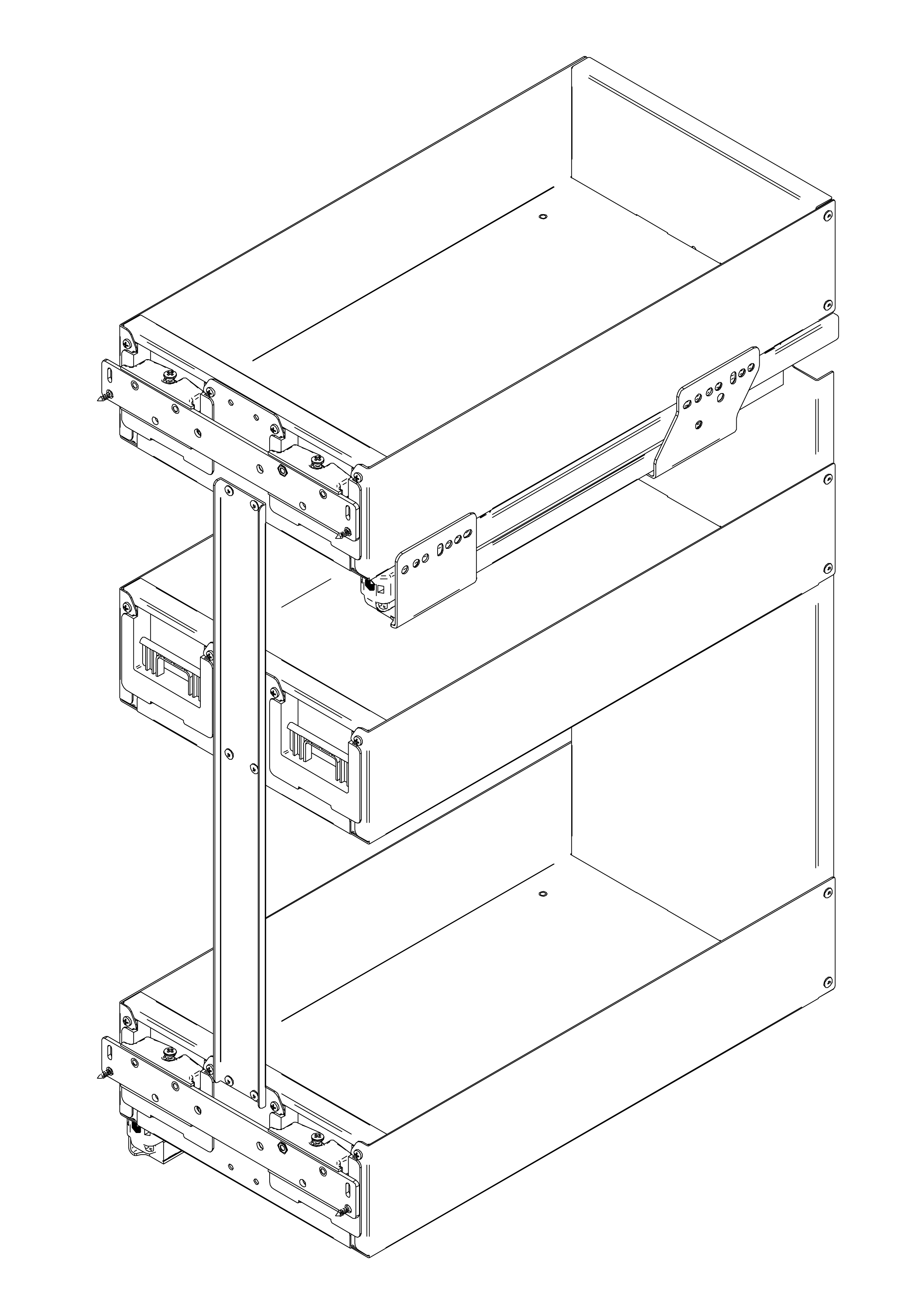 The base pull-out unit offers a large support surface divided into three shelves with sheet metal bottom and edge.