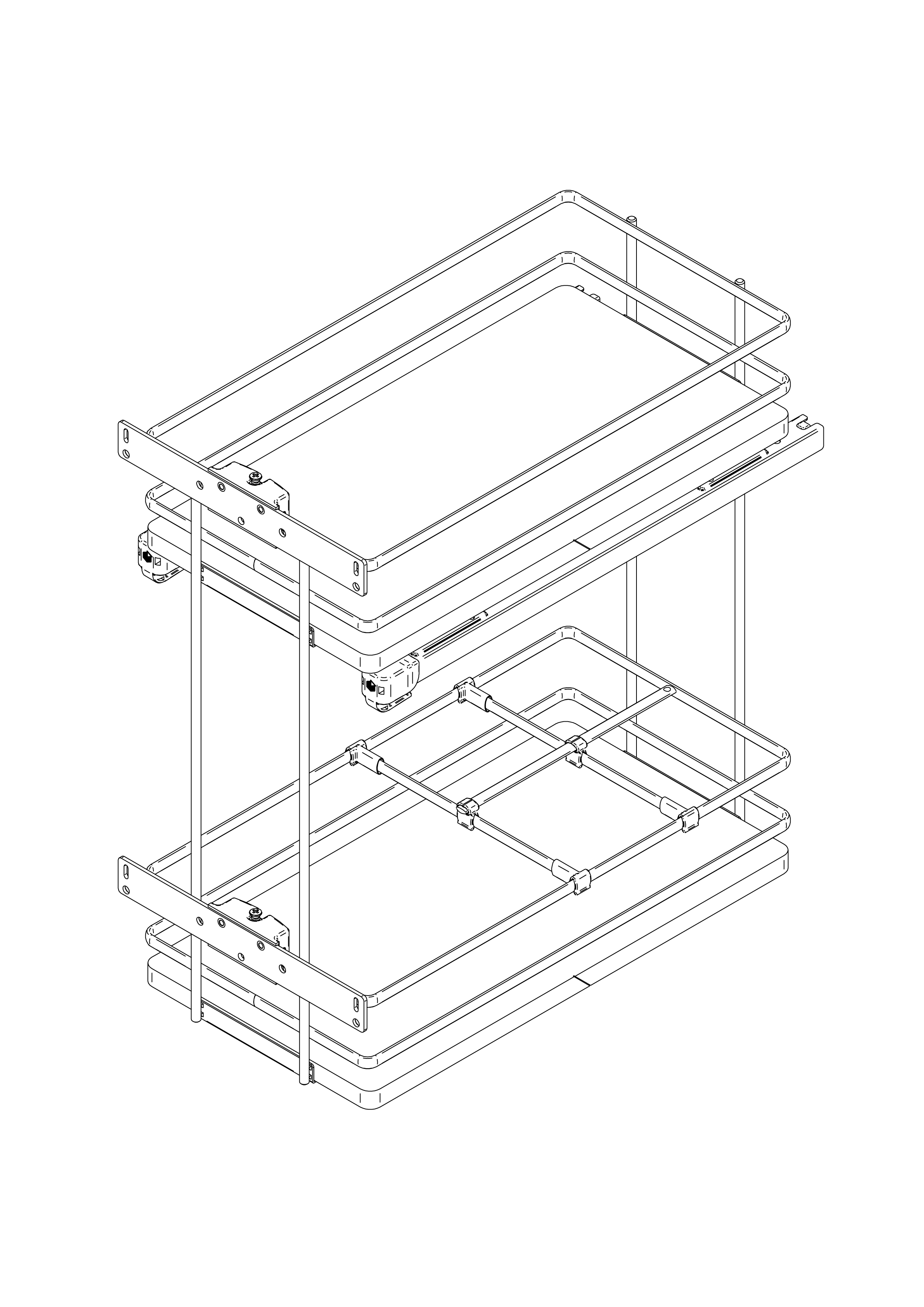 The base pull-out bottle organizer is available in four different modules. It offers a large support surface divided into two shelves with elliptical wire rail and melamine bottom. It allows to take full advantage of the entire length and height of the cabinet ensuring a complete overview and maximum accessibility to its content.