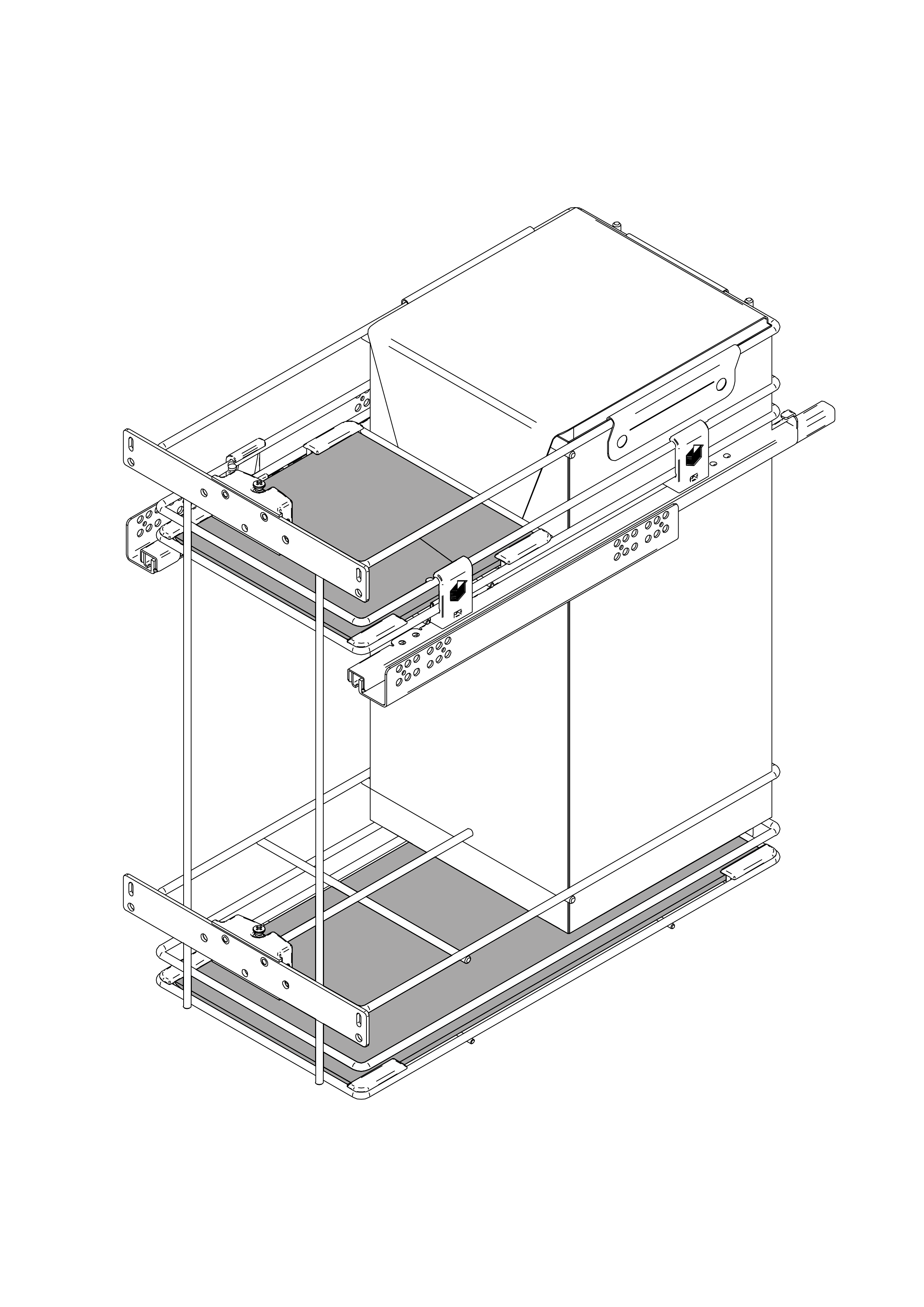 The base pull-out unit with bag provides a large storage area divided into two round wire shelves with HDF bottom.