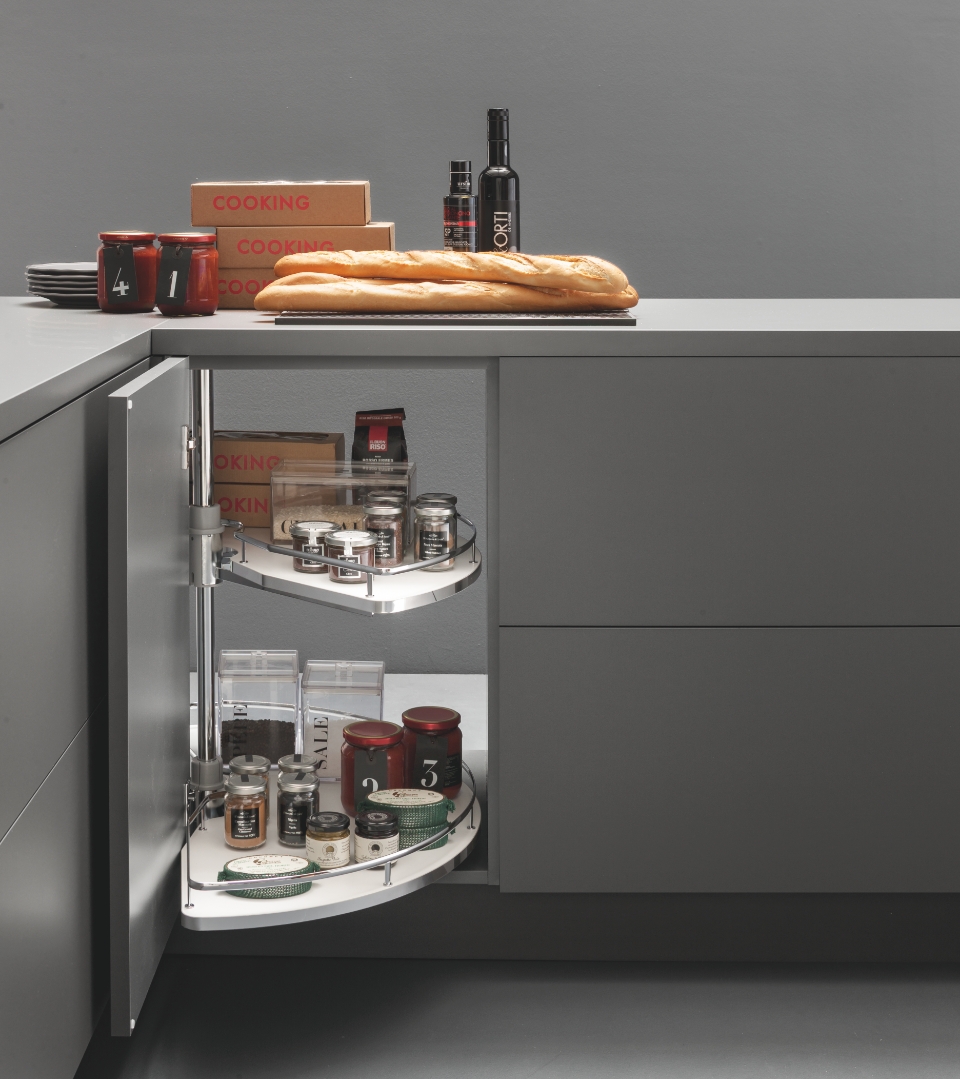 Thanks to the carousels, the waste of space within corner cabinets is minimized. Available in different shapes, in this case an half-circle, they ensure complete customization in terms of modules and product ranges.