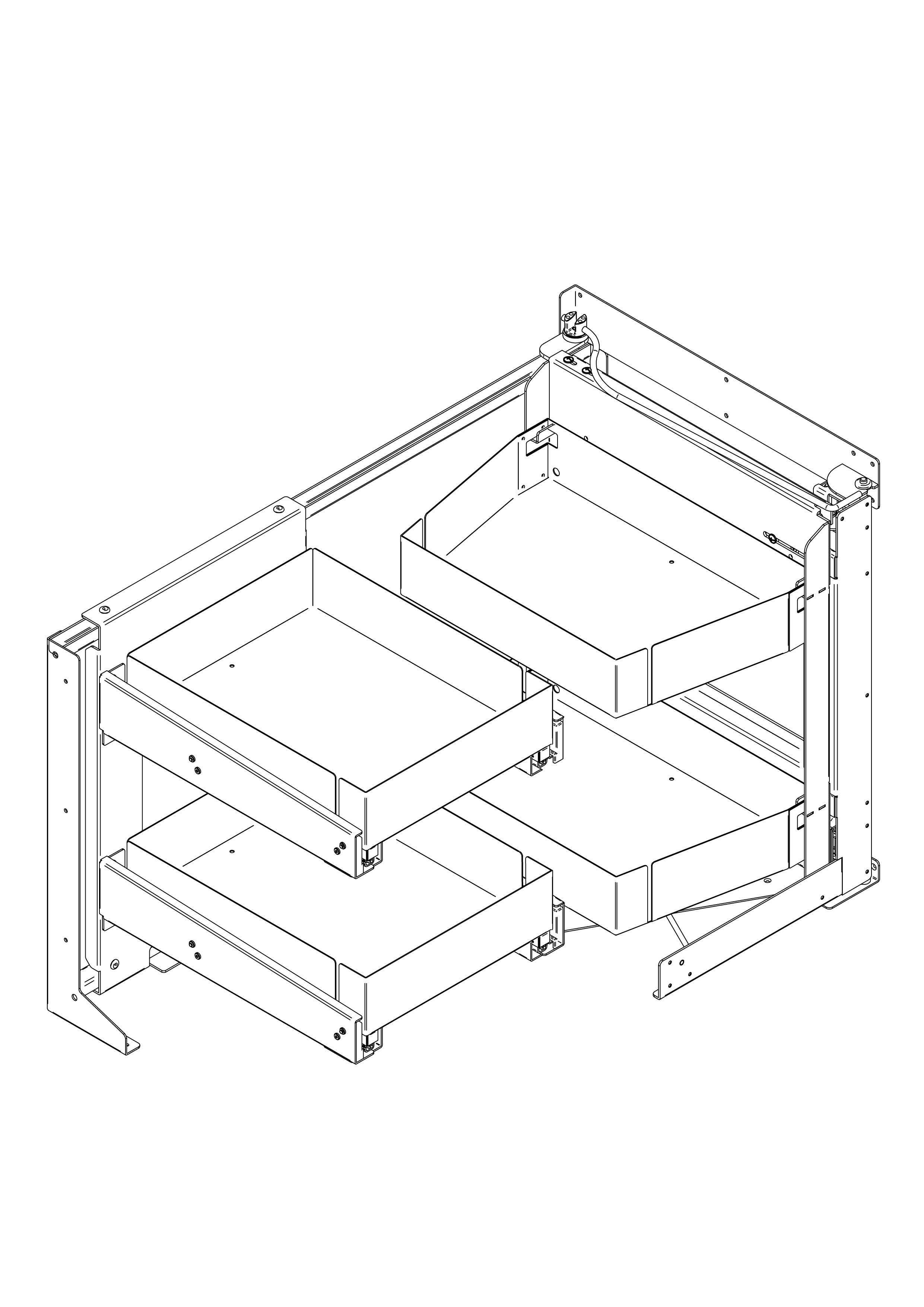 The pull-out Smart Corner makes any corner cabinet "smart." Consisting of a pair of main baskets that come out simultaneously with the cabinet door and a pair of sliding inner baskets that can be pulled out completely, it improves the usability while optimizing the corner and minimizing the waste of space. The possibility to customize across different ranges makes it particularly versatile.