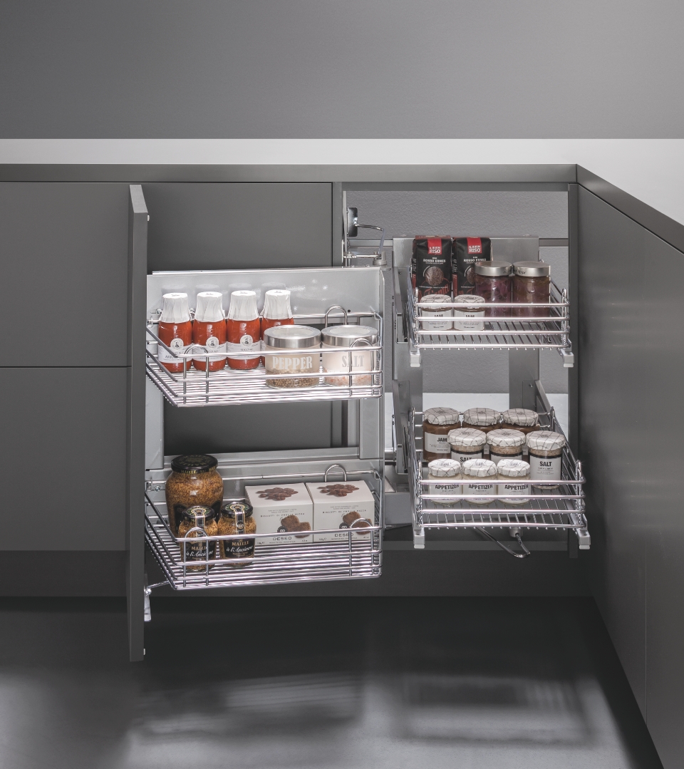 The pull-out Smart Corner makes any corner cabinet "smart." Consisting of a pair of main baskets that come out simoultaneously with the cabinet door and a pair of sliding inner baskets that can be pulled out completely, it improves the usability while optimizing the corner and minimizing the waste of space.