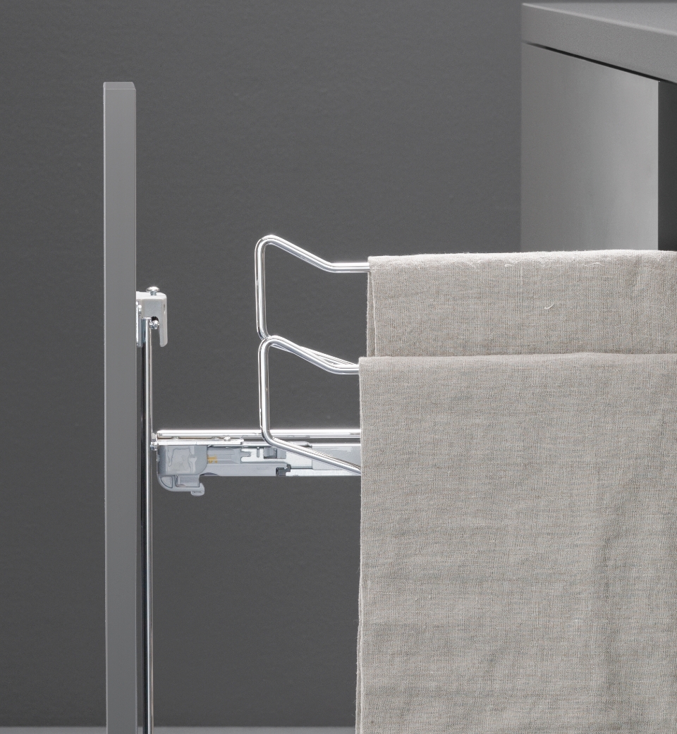 The side-mounted dishtowel holder pull-out unit is the ideal solution for optimizing even the tightest and narrowest spaces in the kitchen.