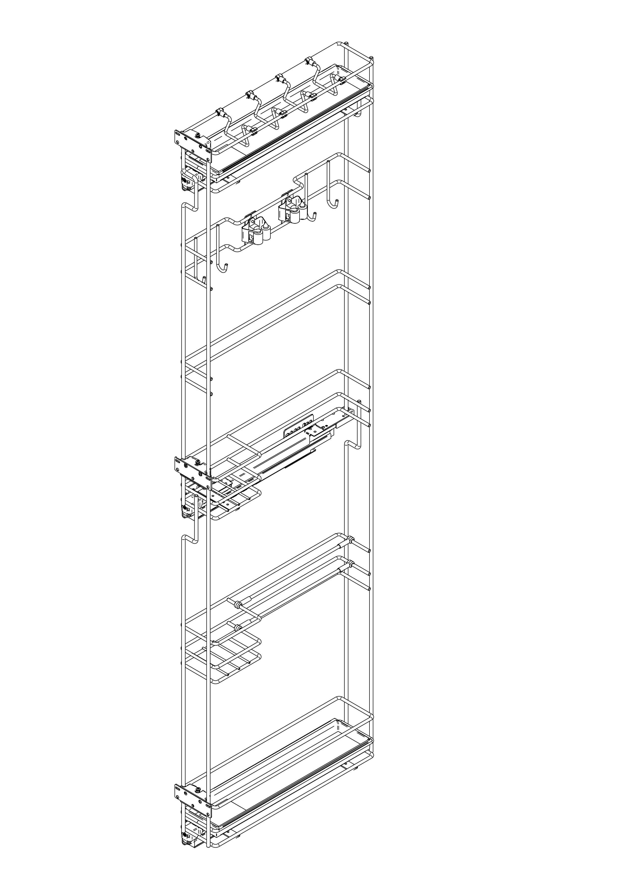 Thanks to the side-mounted pull-out larder unit for brooms, with its five shelves with round wire rail, it is possible to take full advantage even of the tightest spaces and to have a complete accessibility to their content.