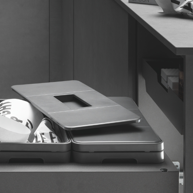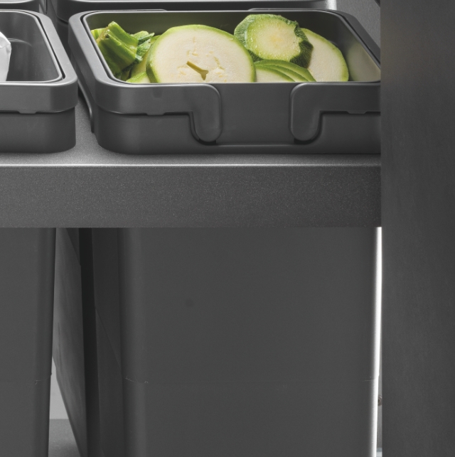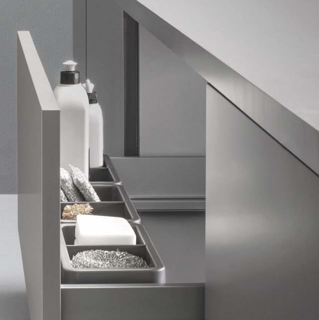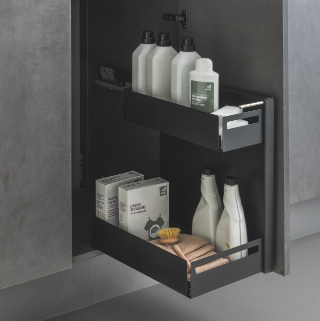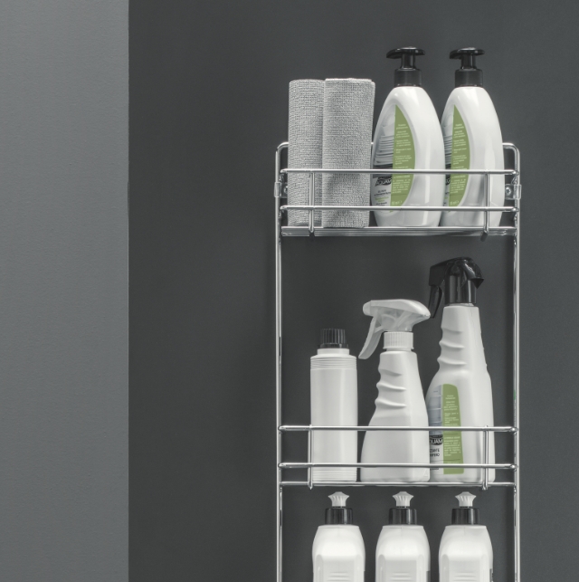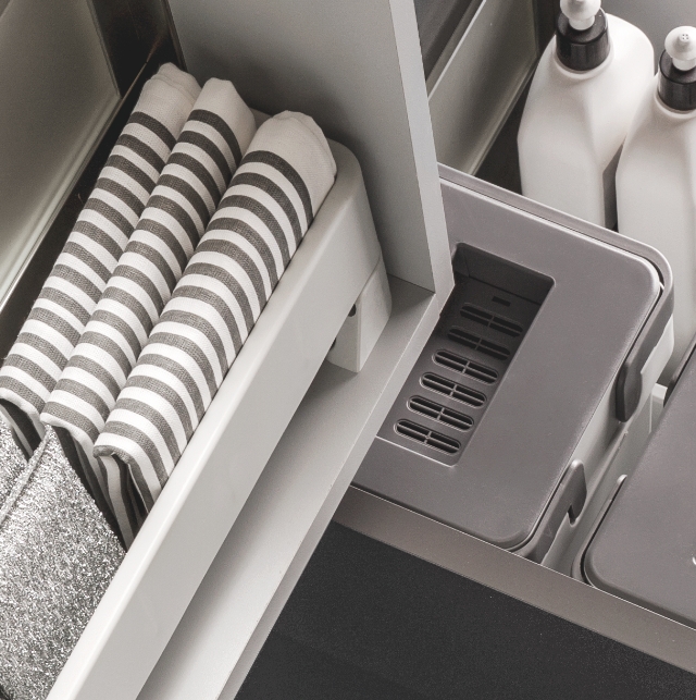 I complementi e gli accessori per la pulizia sono studiati per integrare al meglio la gamma dei sistemi di raccolta differenziata. Ogni elemento può essere utilizzato anche singolarmente, grazie a pratici sistemi di fissaggio applicabili direttamente al cassetto del mobile.