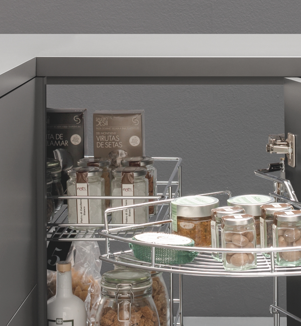 L'Easy Corner rende facilmente accessibile qualsiasi mobile ad angolo. La versione 2+2 è composta da due cesti principali che escono solidali con l'anta e una coppia di cesti interni estraibili.