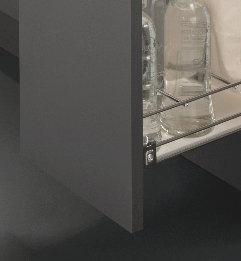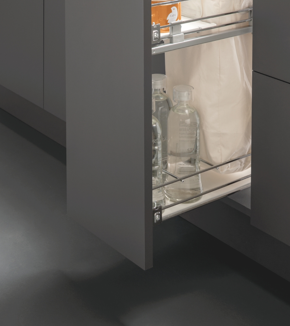 L'aggiunta di una sacca in tessuto, non predisposta per il contatto alimentare, offre un ulteriore spazio contenitivo per stoccare oggetti di vario genere, forma e grandezza. Permette di sfruttare in modo ottimale l'intera lunghezza e altezza del mobile garantendo una completa panoramica e massima accessibilità al suo contenuto.