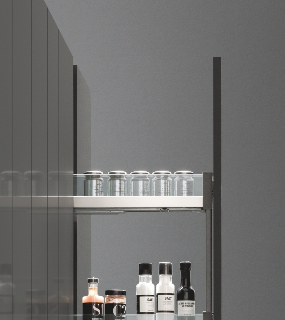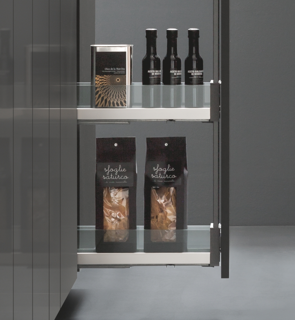 Grazie all'estraibile laterale colonna, con ben cinque ripiani con profilo in vetro fumé o Noce Savoia e fondo in HDF, si è in grado di sfruttare in modo efficiente anche gli spazi più stretti offrendo una completa accessibilità al loro contenuto.