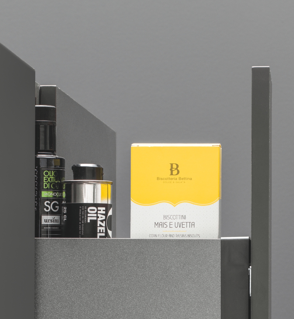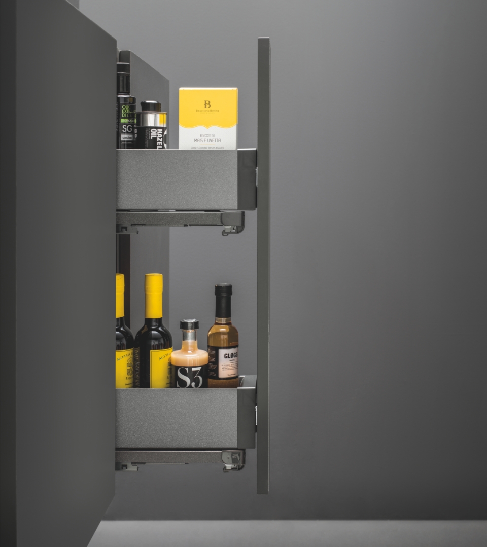L'estraibile laterale pensile consente di accedere in modo pratico ed efficace a ciò che è conservato nel mobile pensile.