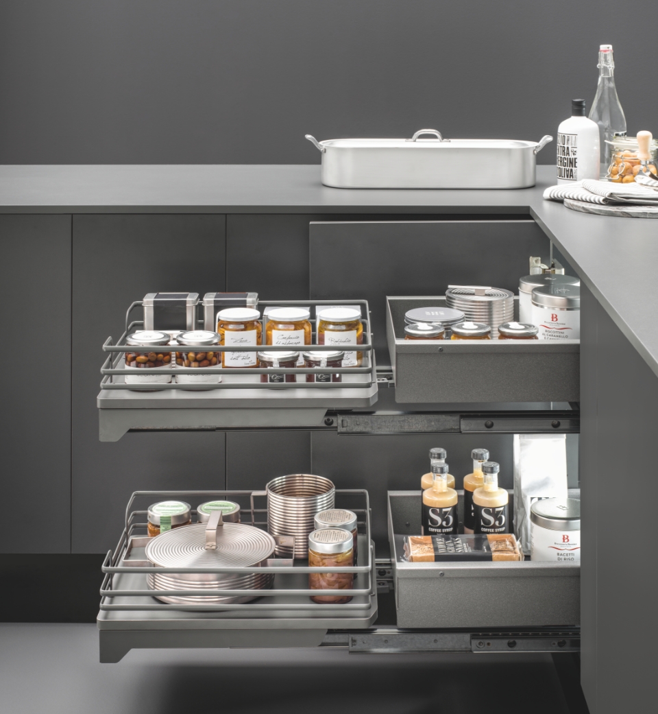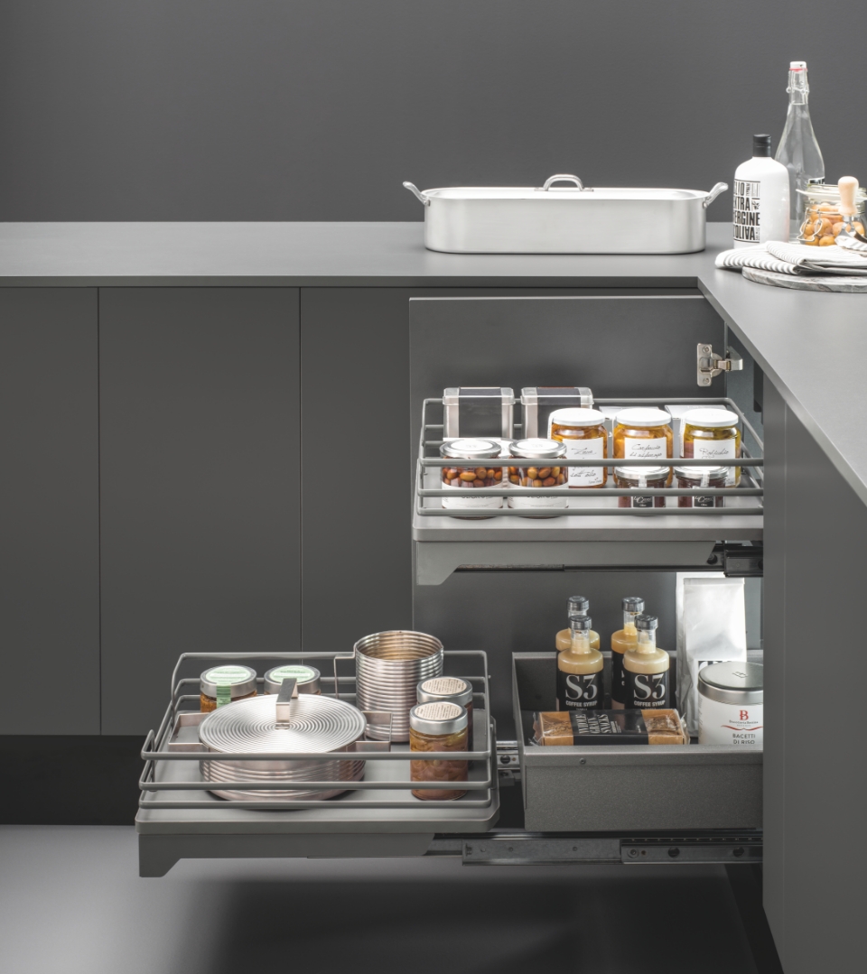 Con il Fly Box la comodità è dietro l'angolo. Un meccanismo angolare in grado di trasformare gli angoli più scomodi e difficili da raggiungere in uno spazio funzionale e dal design essenziale. Caratterizzato da due ripiani frontali con ringhierina di contenimento in filo ellittico e fondo in melamina.