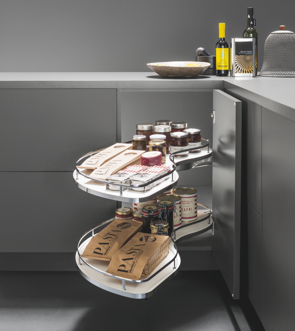 Fly Moon rende accessibile anche gli spazi più nascosti dell'ambiente cucina per poterli sfruttare al massimo e conservare dalle pentole più grandi alle stoviglie. La sua massima versatilità è rappresentata dall'universalità della struttura, la quale è compatibile con i ripiani di altre gamme. In questa versione è disponibile ma non incluso il kit per il rientro ammortizzato.