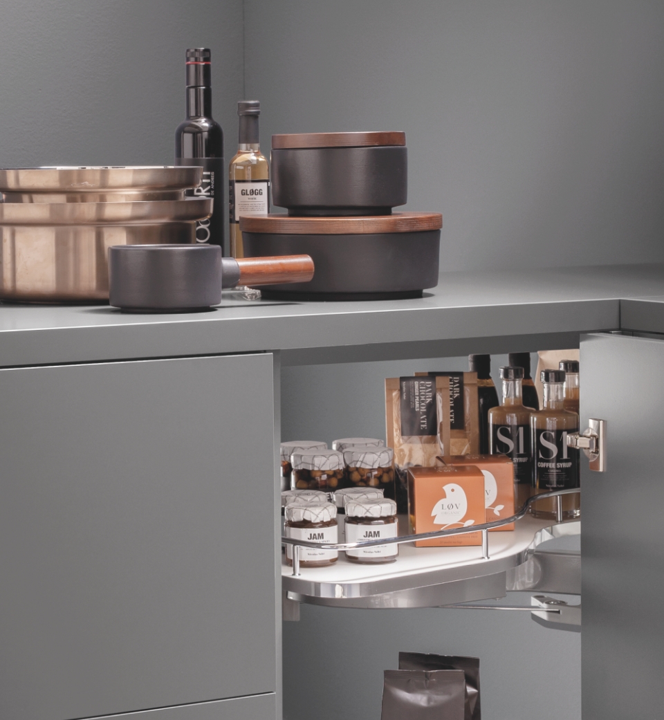 Fly Moon rende accessibile anche gli spazi più nascosti dell'ambiente cucina per poterli sfruttare al massimo e conservare dalle pentole più grandi alle stoviglie. La sua massima versatilità è rappresentata dalla sua struttura universale, compatibile con i ripiani di altre gamme. In questa versione è disponibile ed incluso il kit per il rientro ammortizzato.