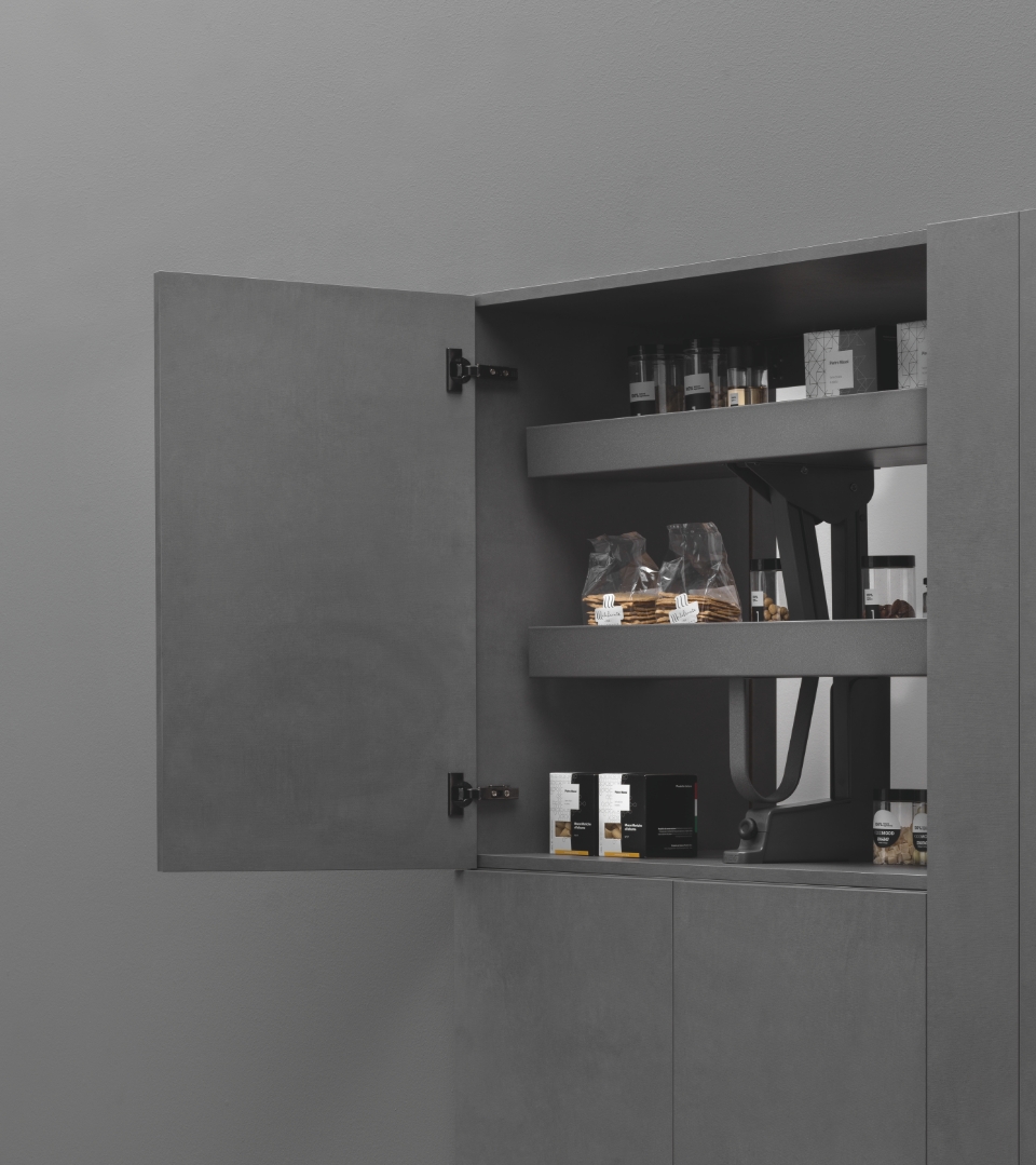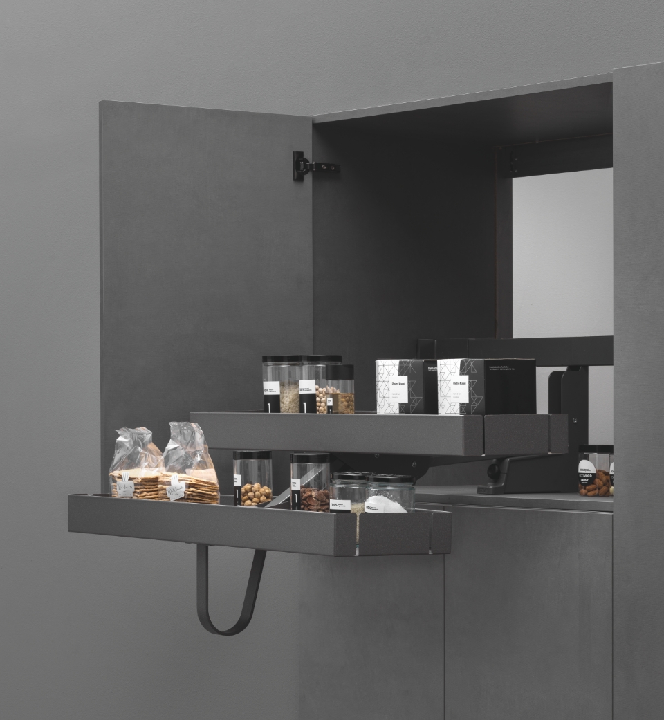 Non soltanto un sempIice saliscendi. Karlo permette di avere la dispensa a portata di mano grazie ad un semplice e fluido movimento verso il basso e simultaneamente verso l’esterno.