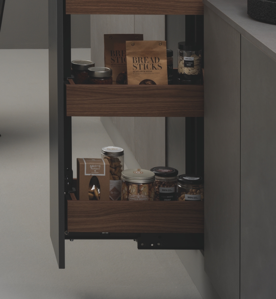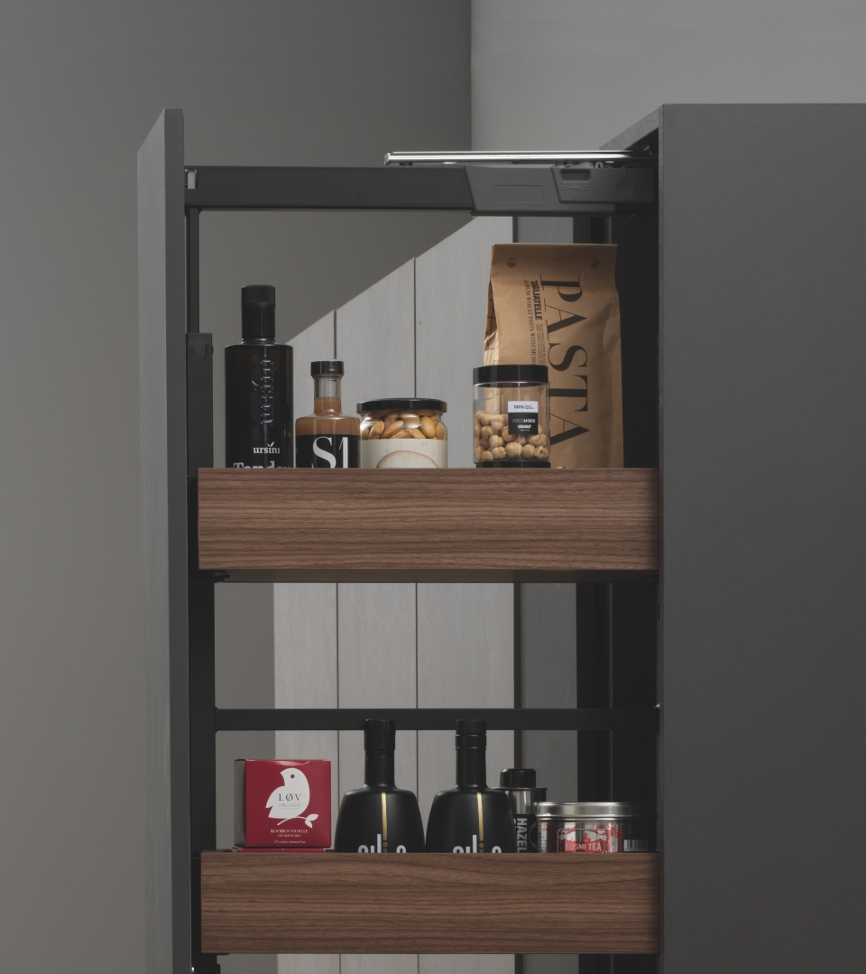 I cesti, con profilo e fondo in MDF, si adattano facilmente a qualsiasi tipologia di cucina e il loro aggancio a scatto consente di installarli e pulirli senza sforzi. In aggiunta, l'universalità della struttura rende possibile accessoriare e personalizzare la colonna con cesti appartenenti ad altre gamme.