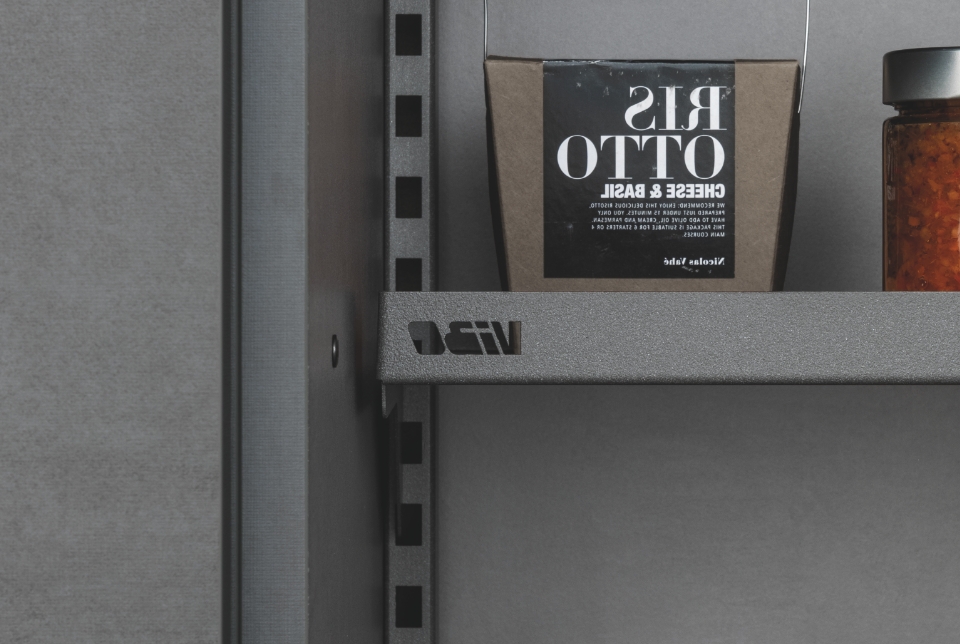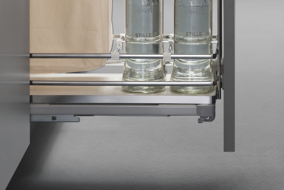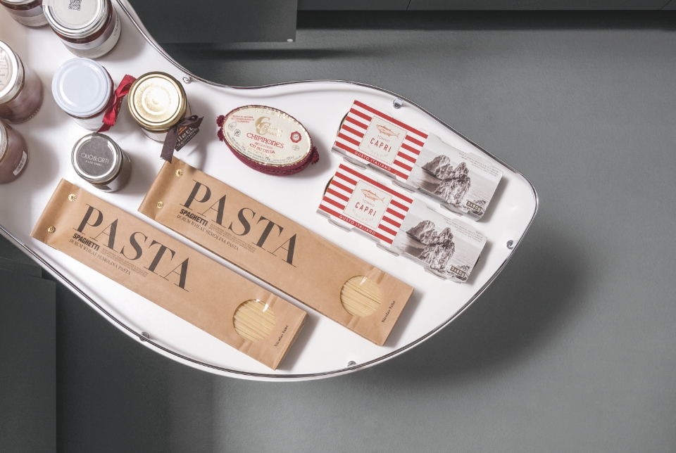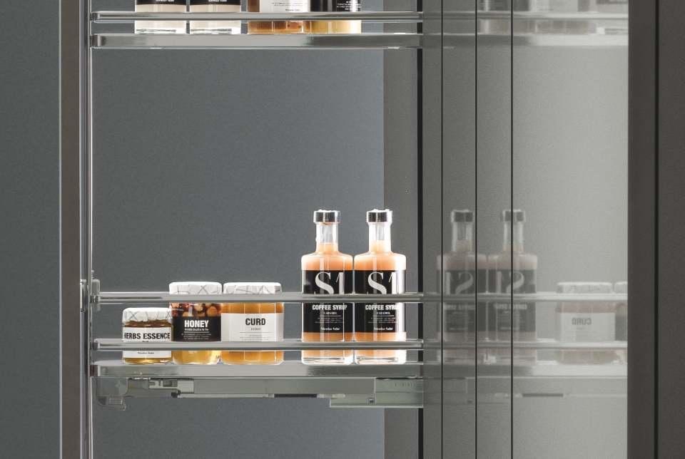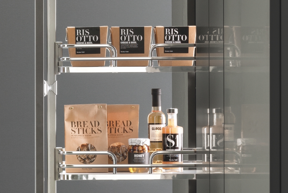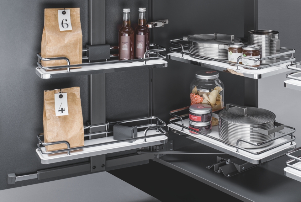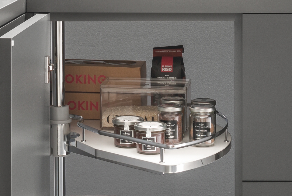 Grazie ai girelli, gli sprechi di spazio all'interno dei mobili angolari della cucina vengono ridotti al minimo. Disponibili in diverse forme, in questo caso una circonferenza di tre quarti, garantiscono la completa personalizzazione in termini di modulistica e gamme prodotto. Offrono comodità non solo nella fruizione di ciò che viene stoccato e conservato al loro interno, ma anche nel montaggio stesso, in particolare grazie al loro sistema "fast block".