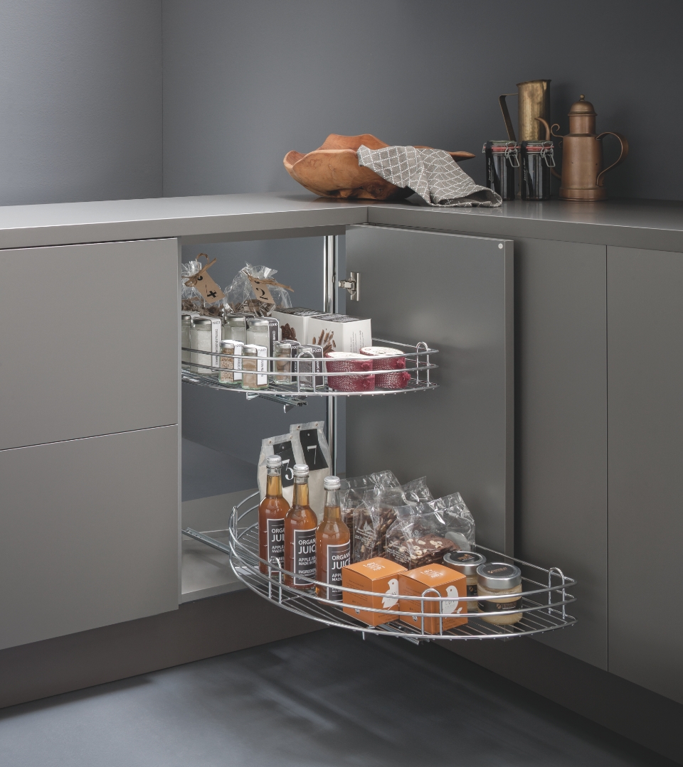 Grazie ai girelli, gli sprechi di spazio all'interno dei mobili angolari vengono ridotti al minimo. Disponibili in diverse forme, in questo caso una mezzaluna, garantiscono la completa personalizzazione in termini di modulistica e gamme prodotto.