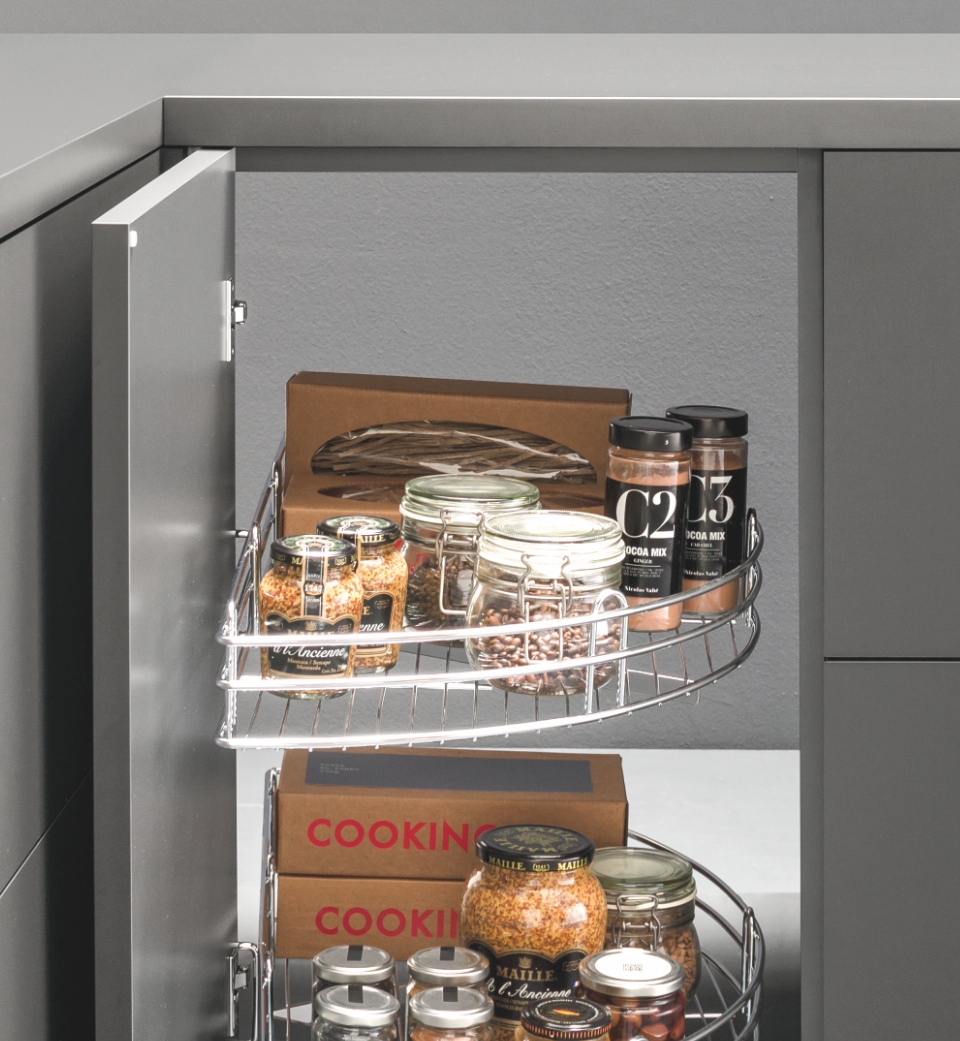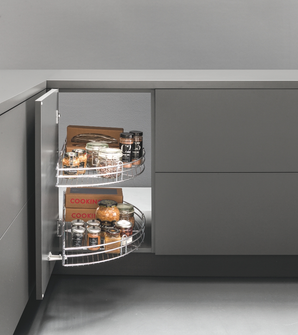 Grazie ai girelli, gli sprechi di spazio all'interno dei mobili angolari vengono ridotti al minimo. Disponibili in diverse forme, in questo caso una mezzaluna, garantiscono la completa personalizzazione in termini di modulistica e gamme prodotto.