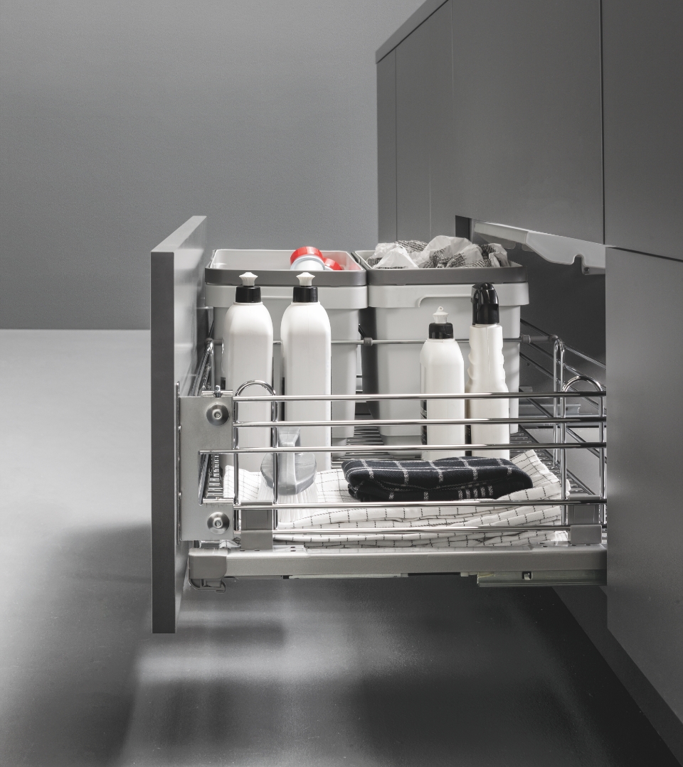 Sistema per la raccolta differenziata composto da due bidoni in polipropilene, ognuno con la capacità di 12 litri, completi di manici per facilitare l'estrazione e abbinate ad un coperchio basculante con fissaggio laterale.