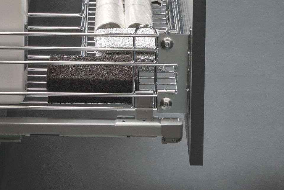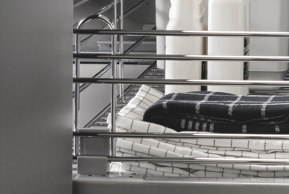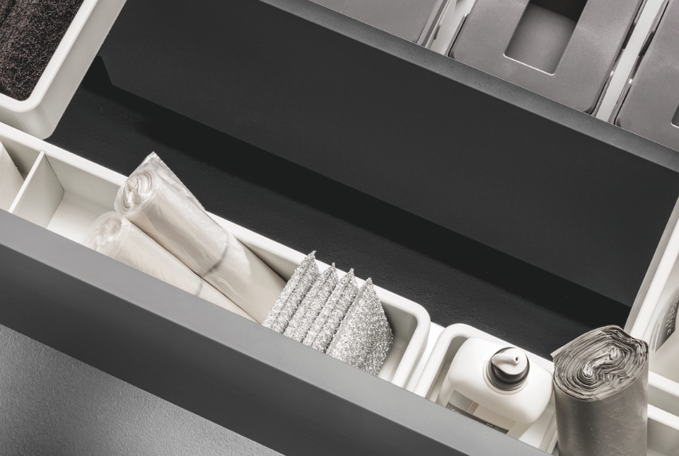 Il kit sottolavello inferiore V è disponibile in tre varianti di altezza per adattarsi alle diverse configurazioni del mobile. Nella parte posteriore integra un pratico vano portadetersivi, pensato per ottimizzare lo spazio.