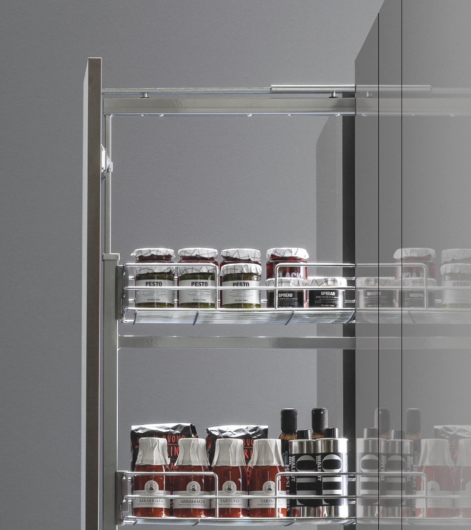 La colonna Vibo è il connubio ideale tra ordine e innovazione. Grazie ad un semplice movimento, permette di avere una visione completa e un facile accesso al suo contenuto, a tutt'altezza, anche sui ripiani superiori. I cesti, con ringhierina e fondo in filo tondo, si adattano facilmente a qualsiasi tipologia di cucina e il loro aggancio a scatto consente di installarli e pulirli senza sforzi. In aggiunta, l'universalità della struttura rende possibile accessoriare e personalizzare la colonna con cesti appartenenti a qualsiasi altra gamma Vibo.