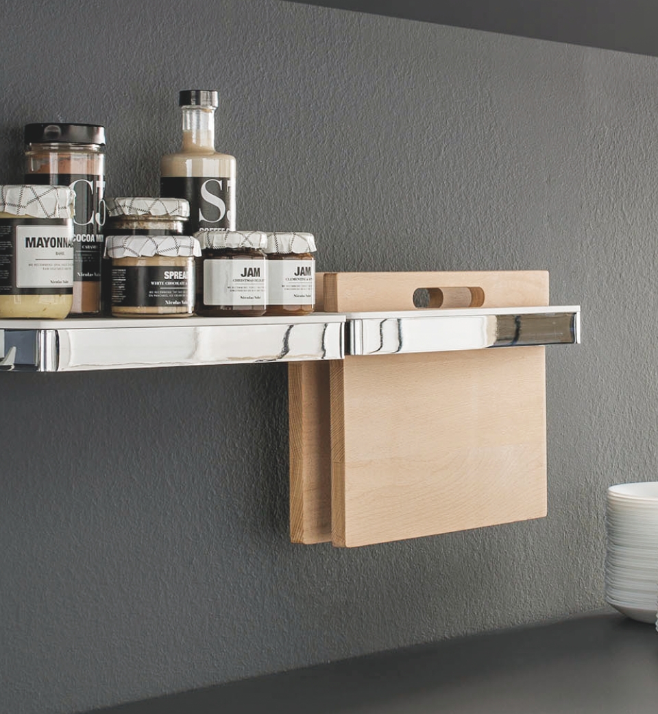 Accessorio con divisorio per riporre due taglieri in legno di faggio, da agganciare sulla barra di supporto della linea Mirage.