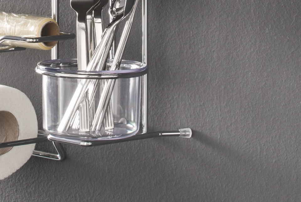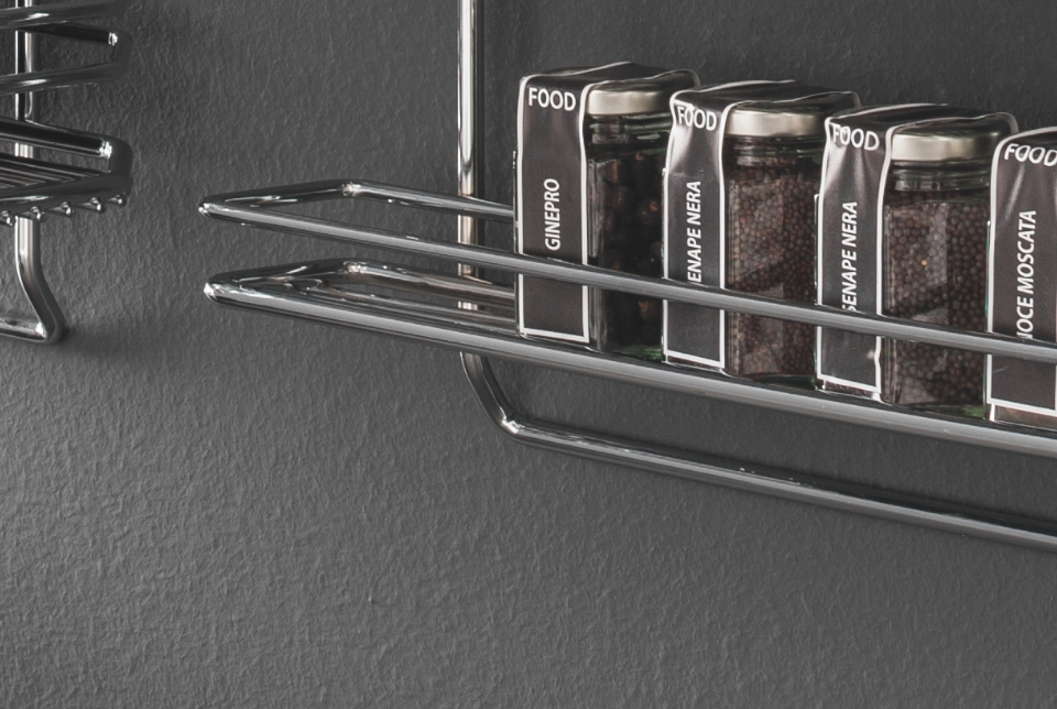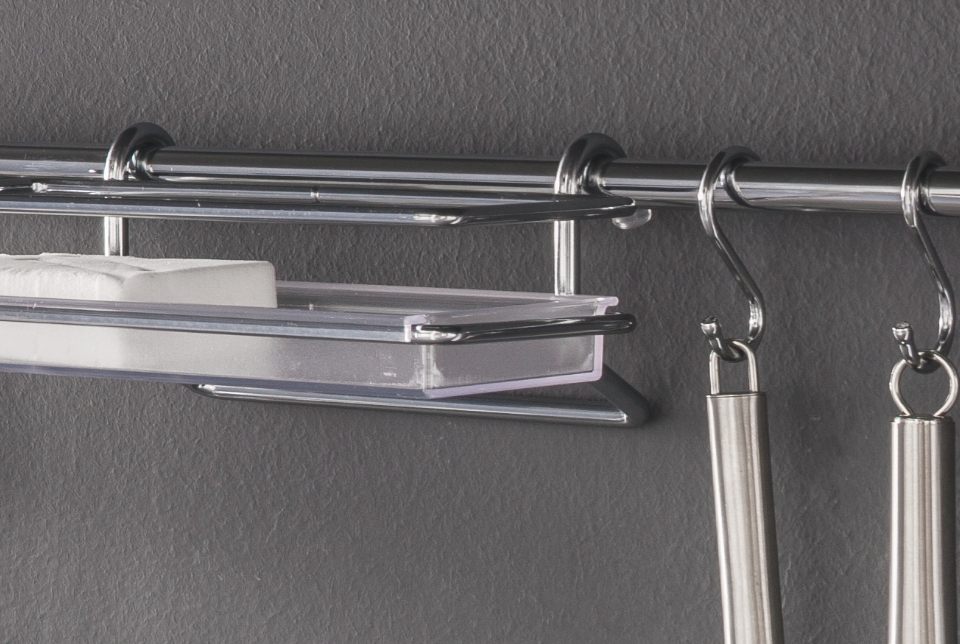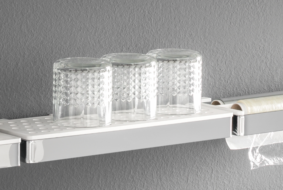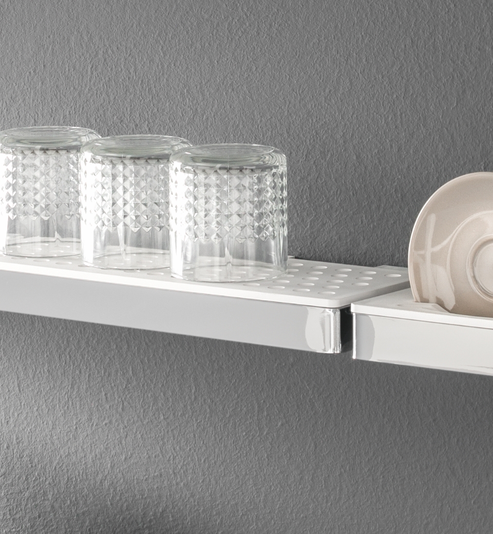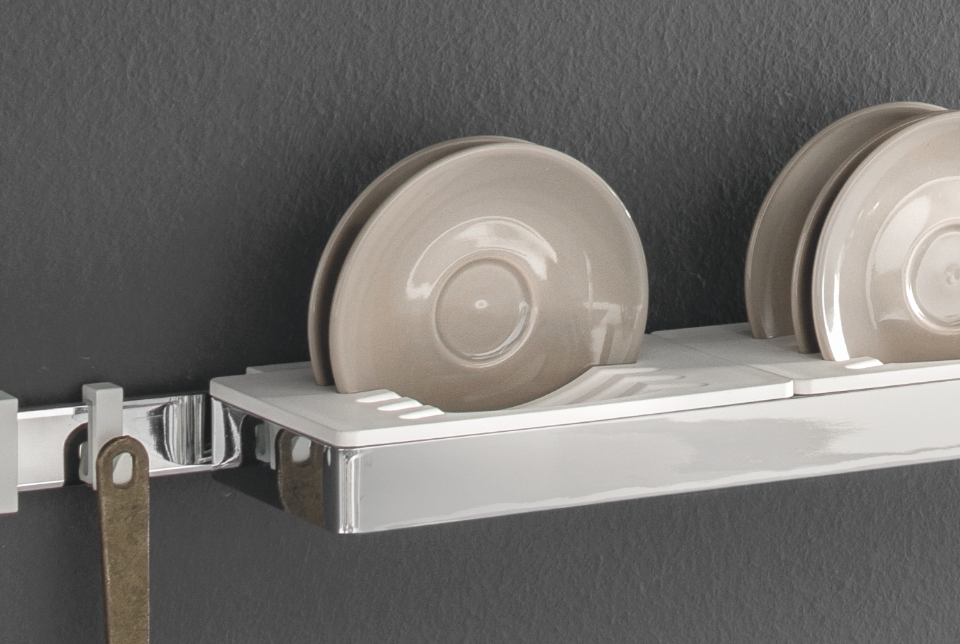 Accessorio mensola per riporre tazze e tazzine con fondo forato per permettere il drenaggio dell'acqua da agganciare alla barra di supporto della linea Mirage.