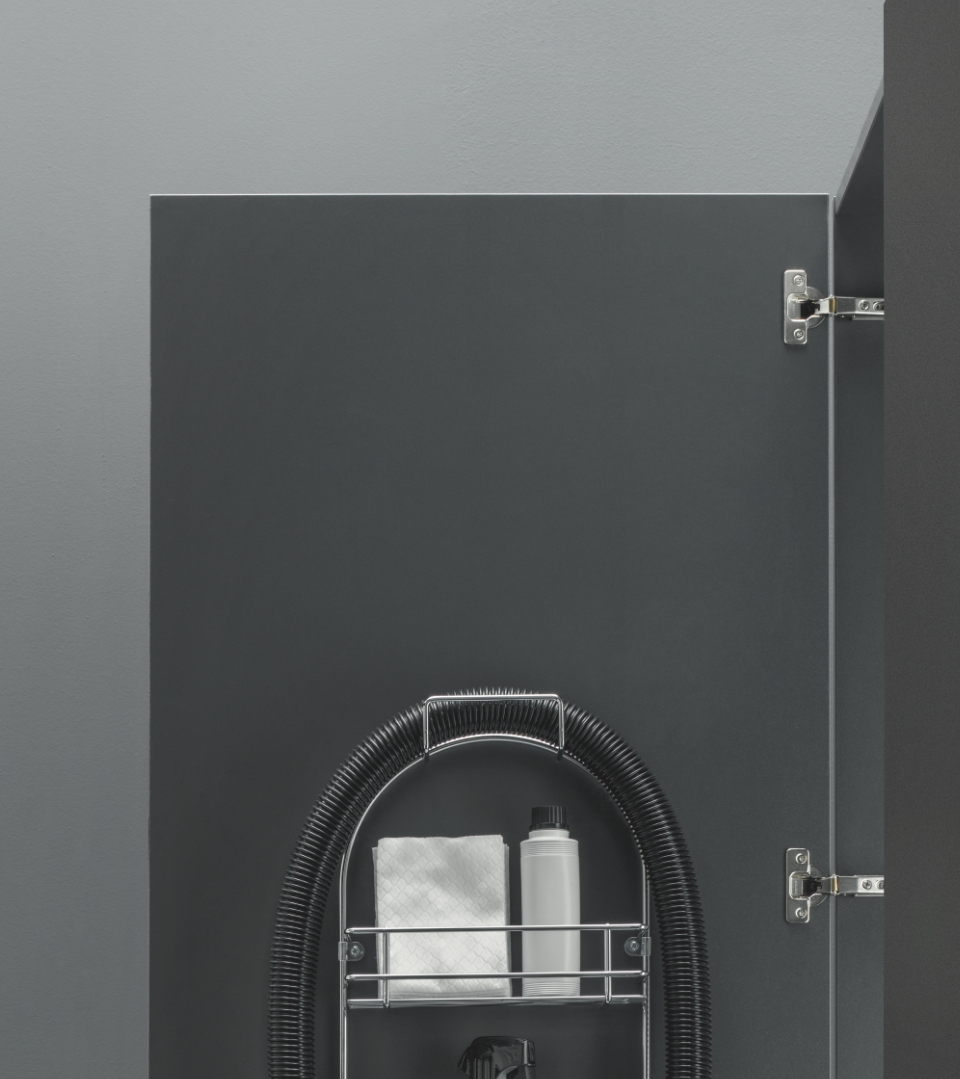 Accessorio in filo progettato per essere agganciato direttamente sull'anta del mobile. La suddivisione in tre ripiani a diversa altezza permette di riporre e appendere ordinatamente tutto l'occorrente per la pulizia con l'aggiunta di un gancio speciale nella parte superiore per bloccare il tubo dell'aspirapolvere e avvolgerlo seguendo la forma circolare della struttura.