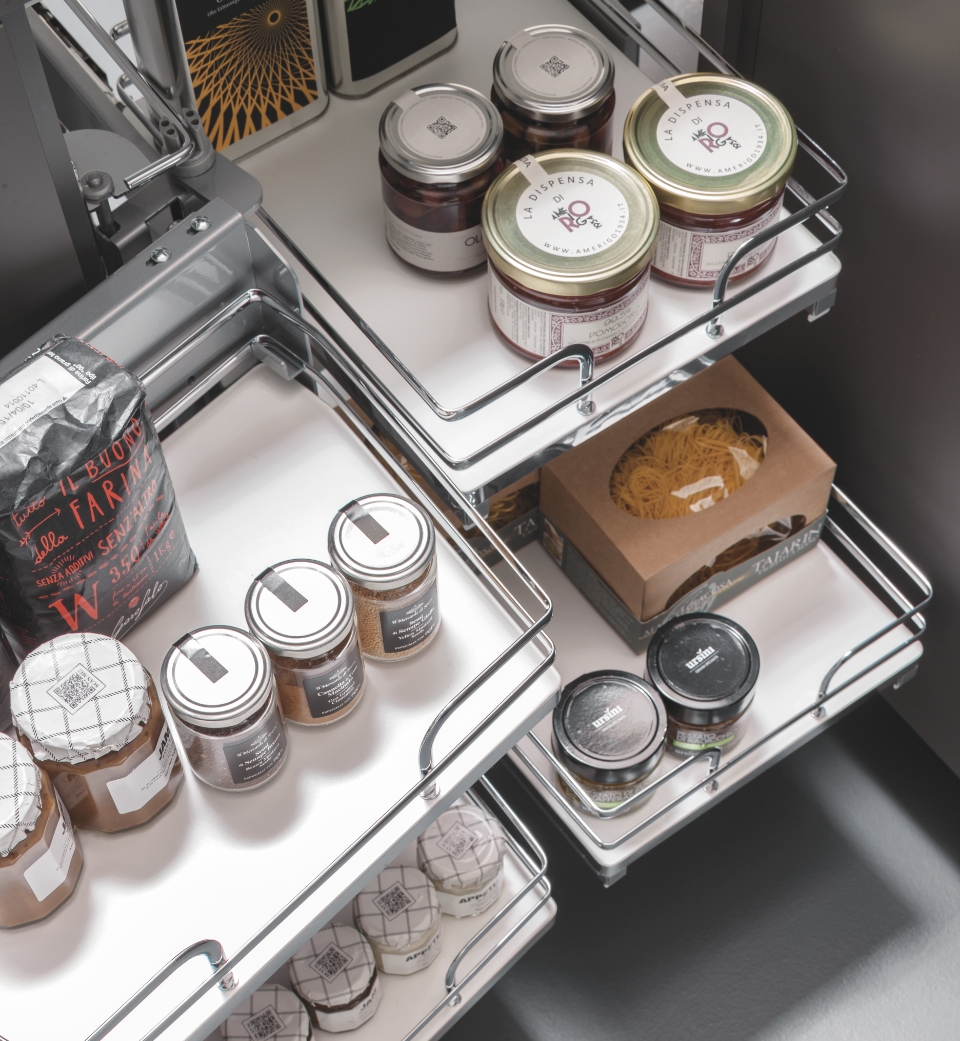 Lo Smart Corner estraibile rende "intelligente" qualsiasi mobile angolare. Composto da una coppia di cesti principali che esce solidale con l'anta e una coppia di cesti interni scorrevoli ed estraibili totalmente, migliora la fruibilità ottimizzando, al contempo, l'angolo e riducendo al minimo le perdite di spazio. La possibilità di personalizzazione in diverse gamme lo rende particolarmente versatile.