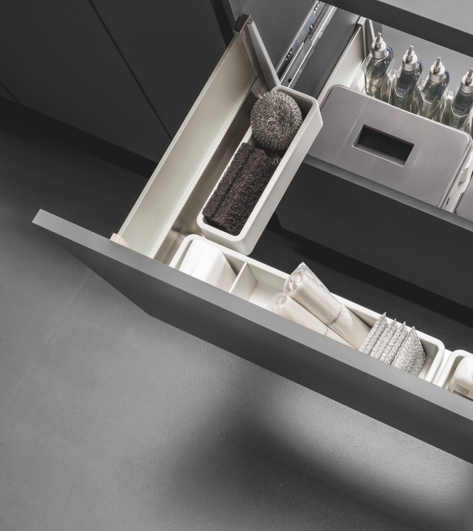Sottolavello superiore realizzato con struttura autoportante in lamiera elettrozincata. Le vaschette laterali e frontali con divisori possono essere posizionate a seconda delle esigenze, assicurando dunque versatilità e una buona ottimizzazione dello spazio.