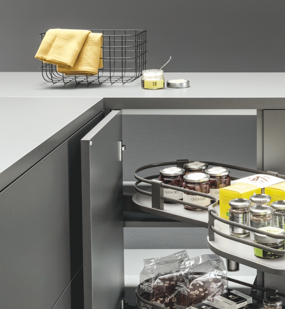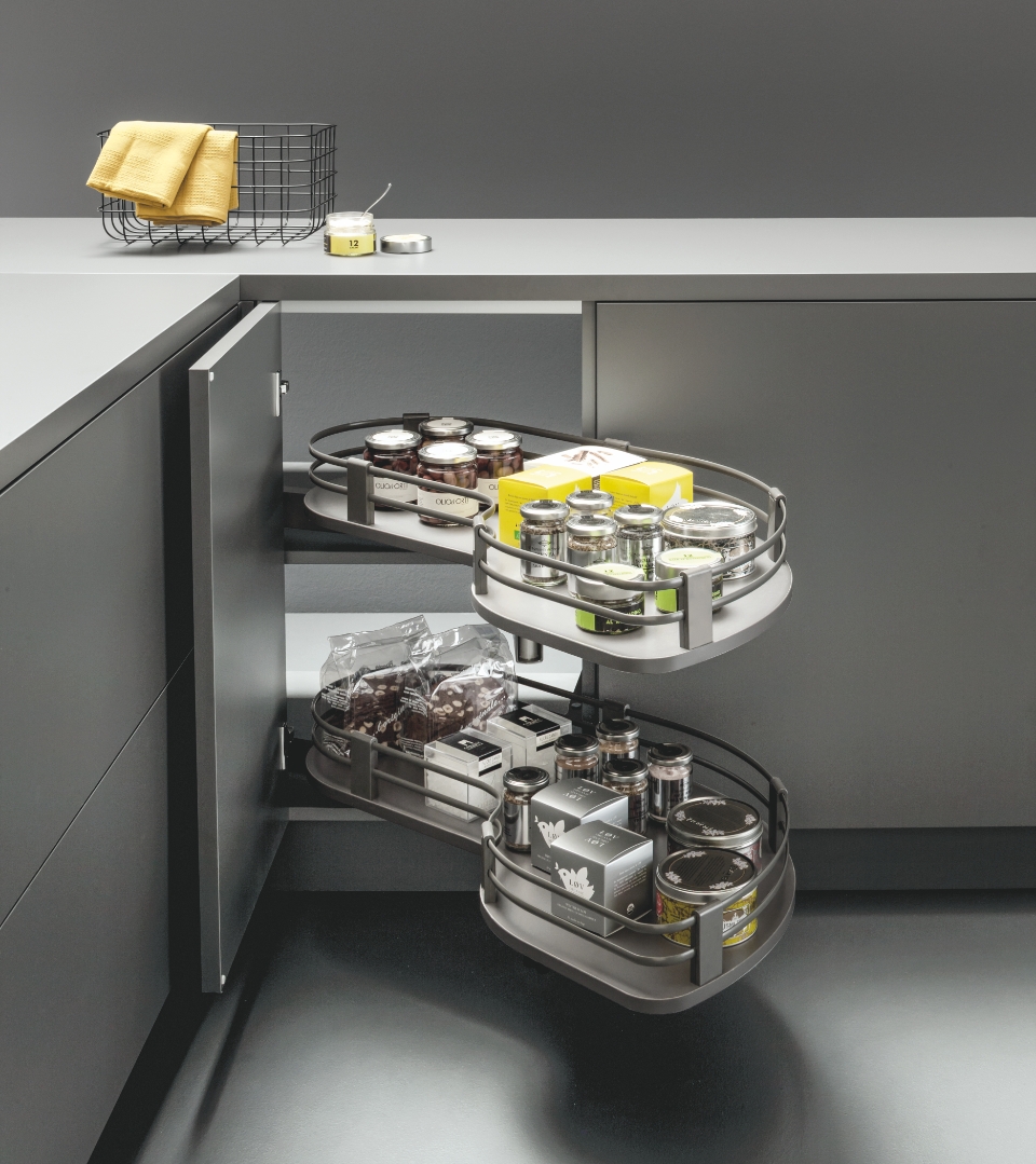 Il meccanismo angolare Uniko consente di avere tutto l'occorrente a portata di mano con un unico ripiano indipendente in filo ellittico e fondo in melamina che può essere fissato direttamente sul fondo o su un ripiano già esistente.