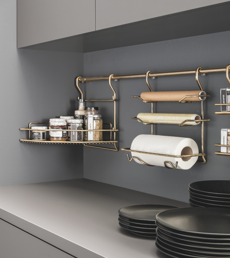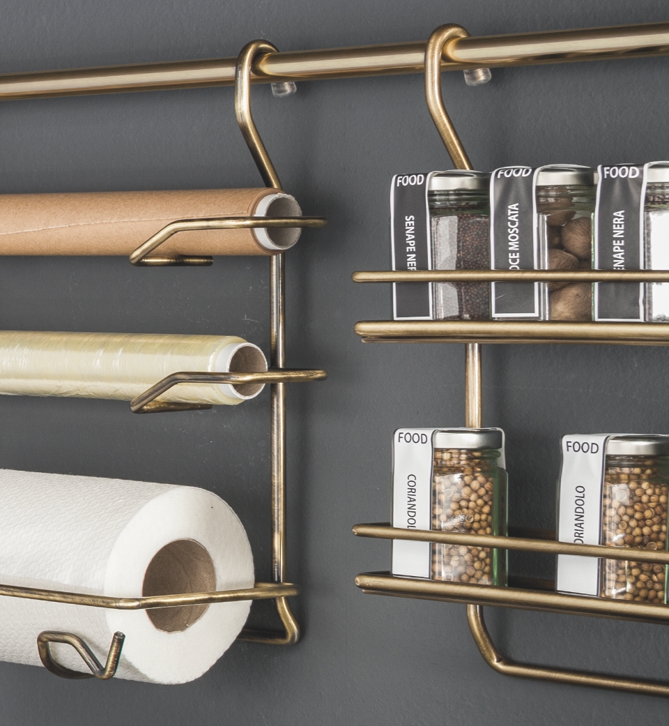 Round wire accessory consisting of three shelves for storing different types of kitchen rolls and designed to be attached to the Wire support bar.
