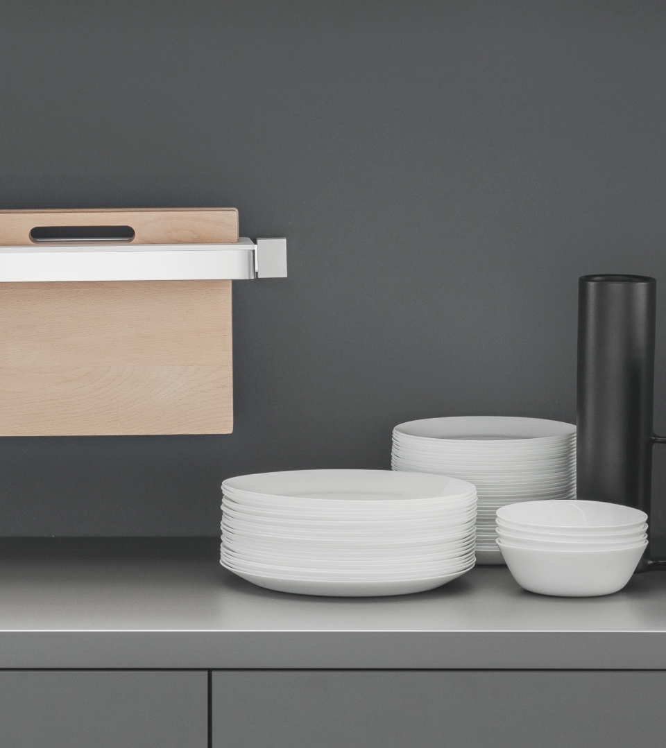 Accessory with divider for storing two beech wood cutting boards, designed to be attached to the Mirage support bar.