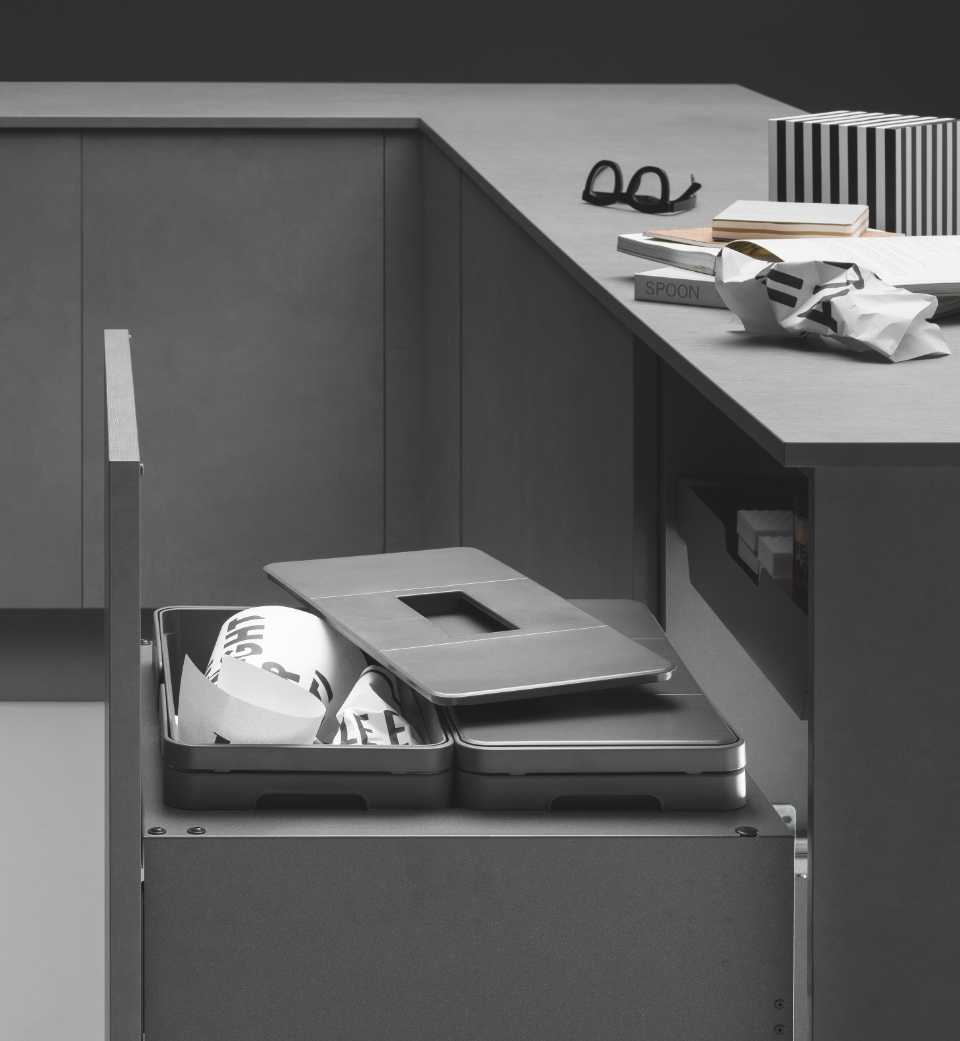 In particular, the lid dedicated to the organic waste section includes an activated carbon and odor filter. The sheet metal structure, completely redesigned from the previous series, has been conceived in order to cover the over extension slides, making them invisible. The maximum optimization of the cabinet space is ensured by the variety of combinations offered.