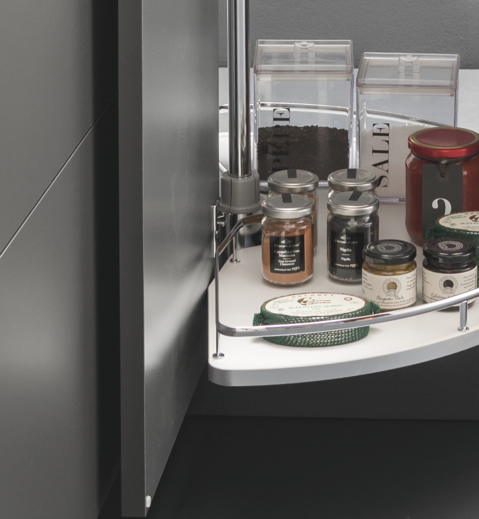 Thanks to the carousels, the waste of space within corner cabinets is minimized. Available in different shapes, in this case an half-circle, they ensure complete customization in terms of modules and product ranges.