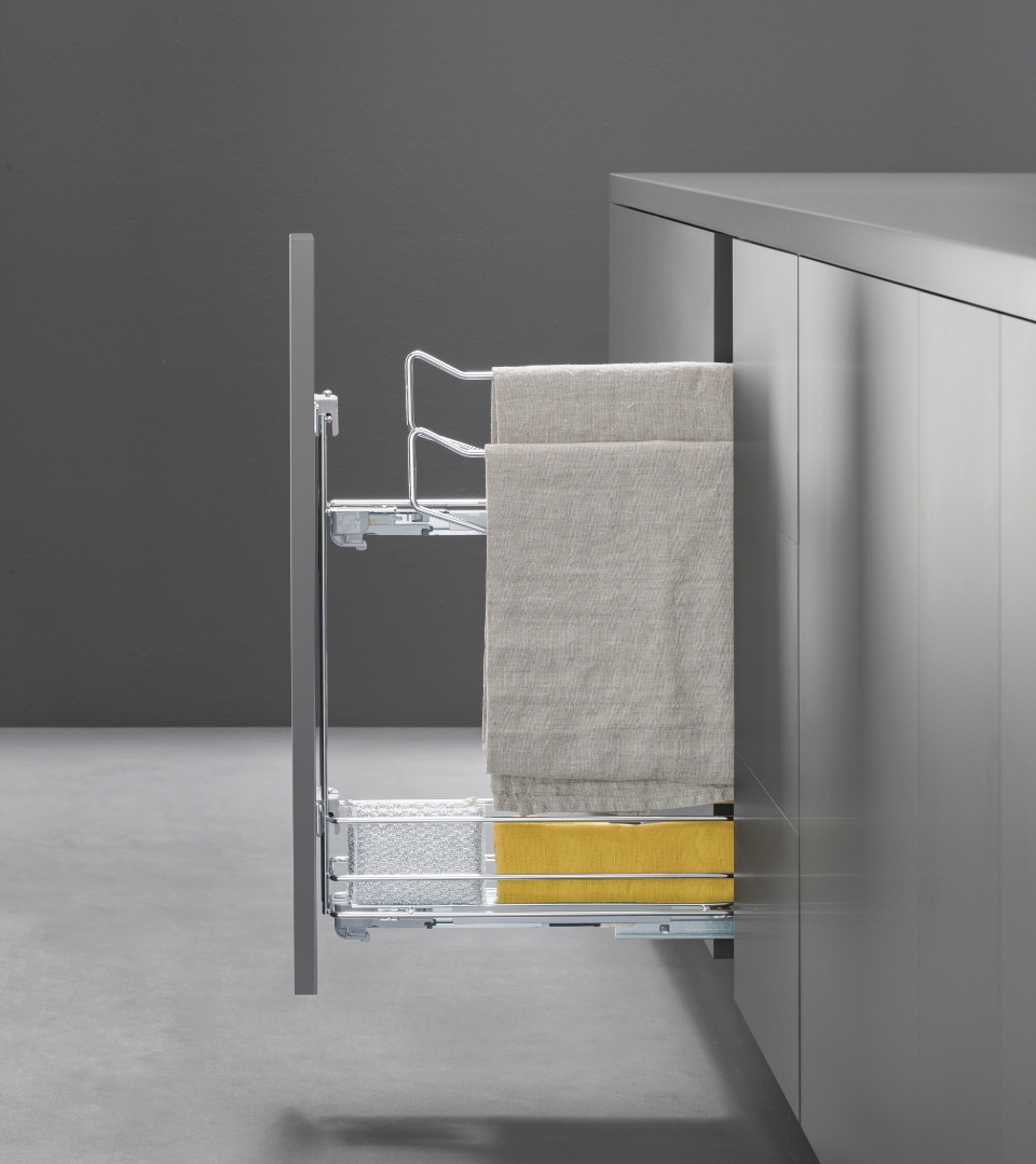 The side-mounted dishtowel holder pull-out unit is the ideal solution for optimizing even the tightest and narrowest spaces in the kitchen.