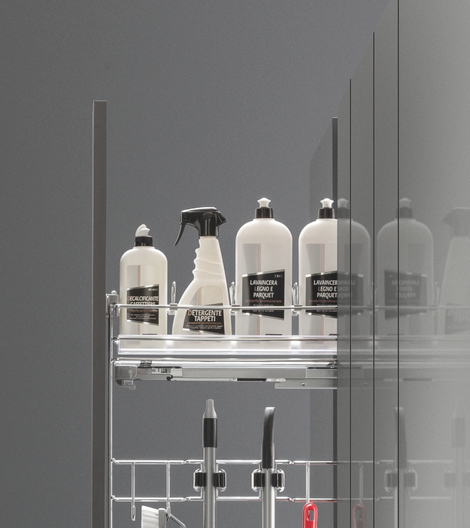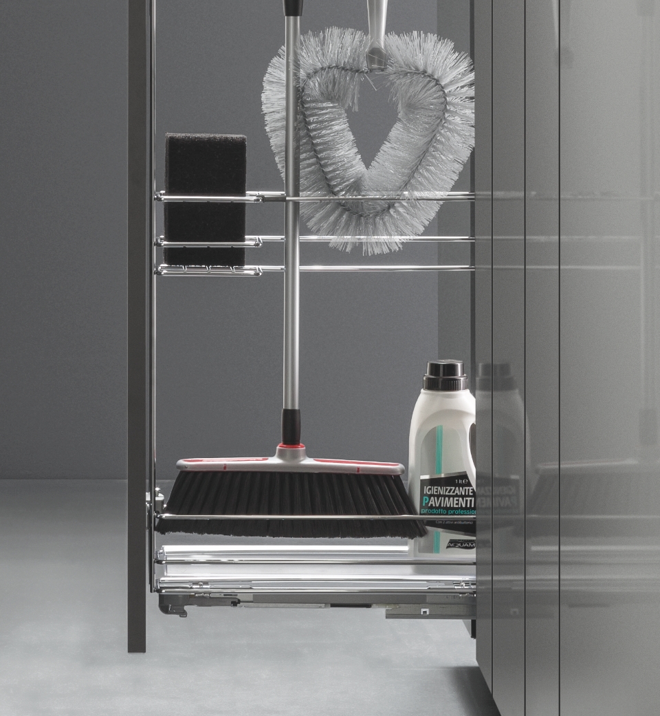 Thanks to the side-mounted pull-out larder unit for brooms, with its five shelves with round wire rail, it is possible to take full advantage even of the tightest spaces and to have a complete accessibility to their content.
