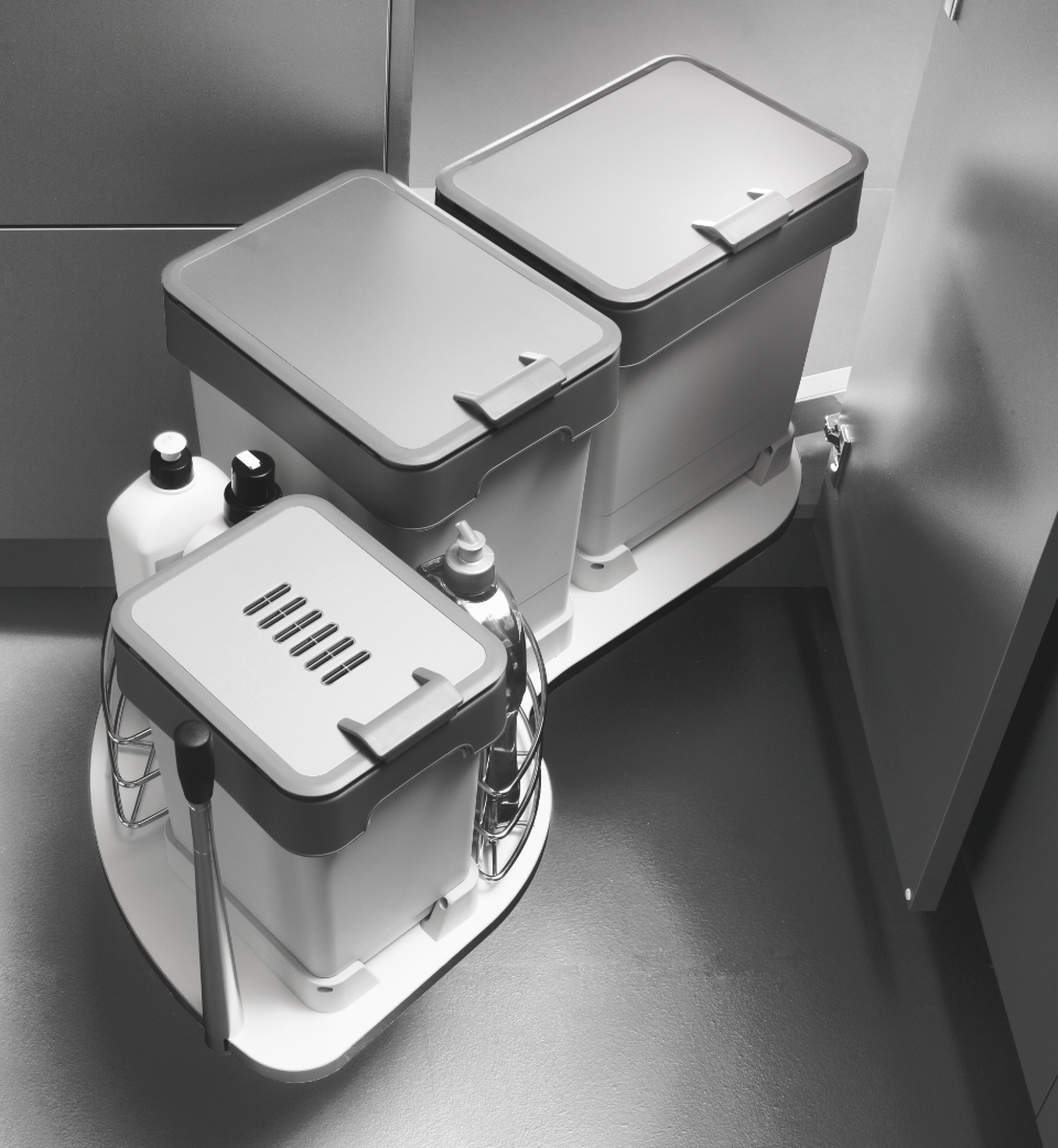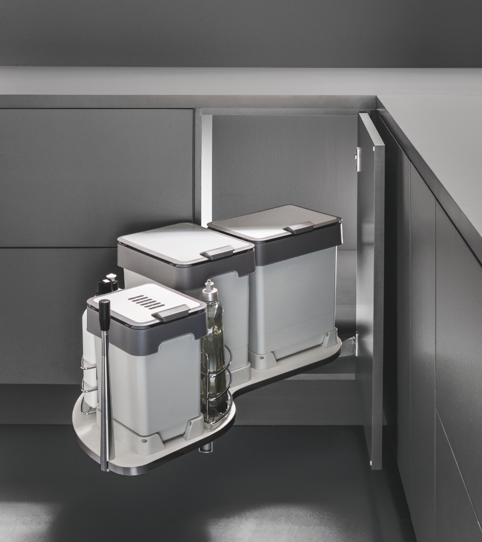 Uniko Patt is a waste recycling bin system designed to optimize space within a corner cabinet.