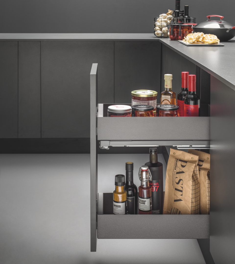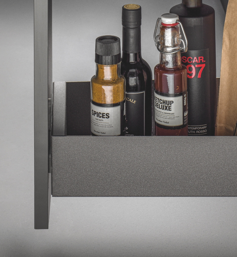 L'estraibile base portabottiglie è disponibile in quattro diversi moduli. Offre un'ampia superficie di appoggio divisa su due ripiani con profilo di contenimento e fondo in lamiera. Permette di sfruttare lo spazio del mobile, garantendo una completa panoramica e massima accessibilità al suo contenuto.