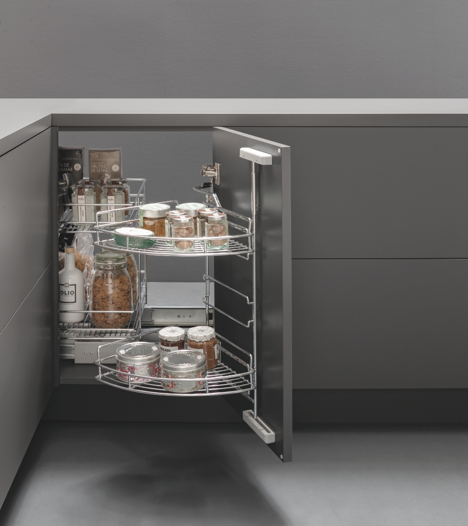 L'Easy Corner rende facilmente accessibile qualsiasi mobile ad angolo. La versione 2+2 è composta da due cesti principali che escono solidali con l'anta e una coppia di cesti interni estraibili.
