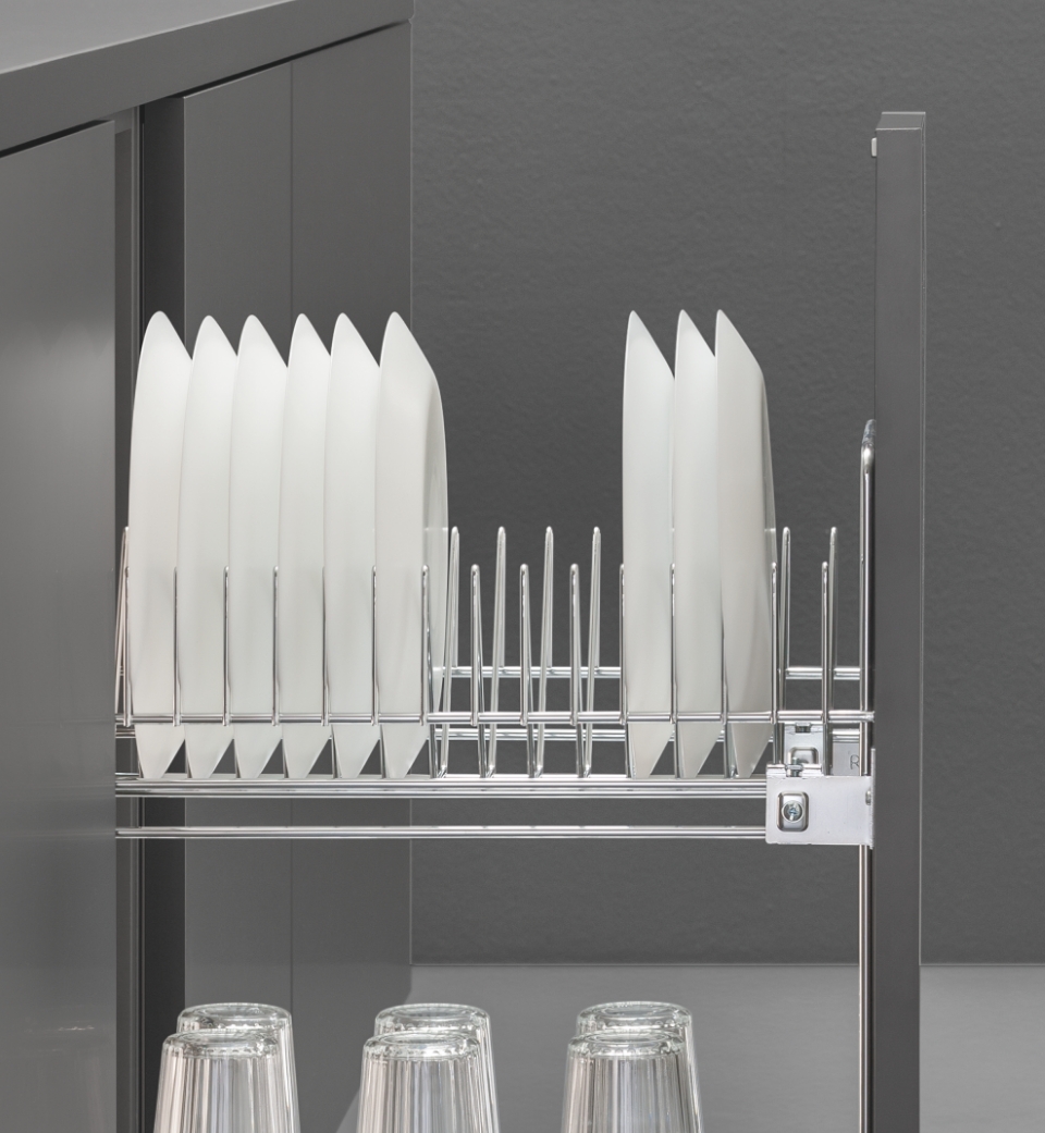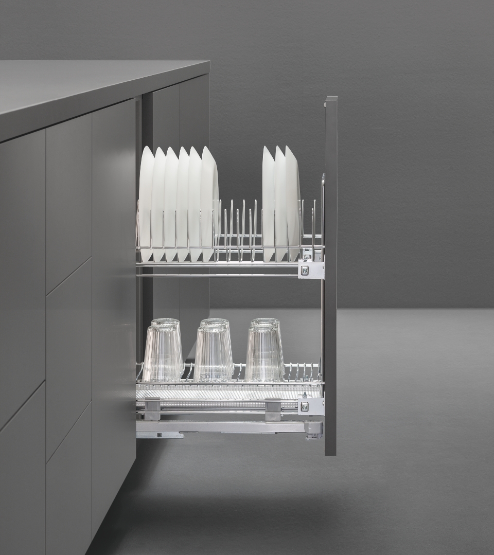 L'estraibile base portapiatti include due diverse tipologie di griglie scolapiatti suddivise su due ripiani in filo tondo ad altezze diverse e un fondo raccogligocce in alluminio.