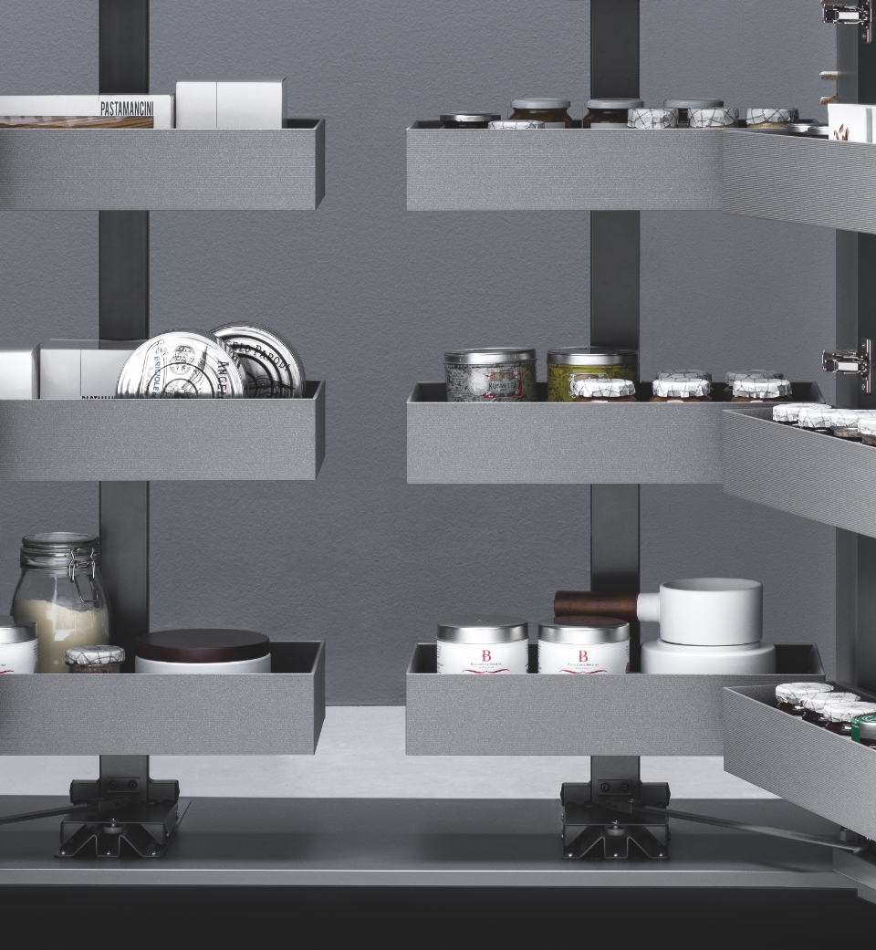 L’estraibile doppio diventa sinonimo di dispensa ben organizzata. I cesti Urban, facilmente sganciabili per permettere un’efficace pulizia, presentano il profilo in alluminio e il fondo in melamina con finitura Galassia. Tuttavia, l'universalità della struttura rende possibile accessoriare e personalizzare l'estraibile doppio con cesti appartenenti a qualsiasi altra gamma Vibo.