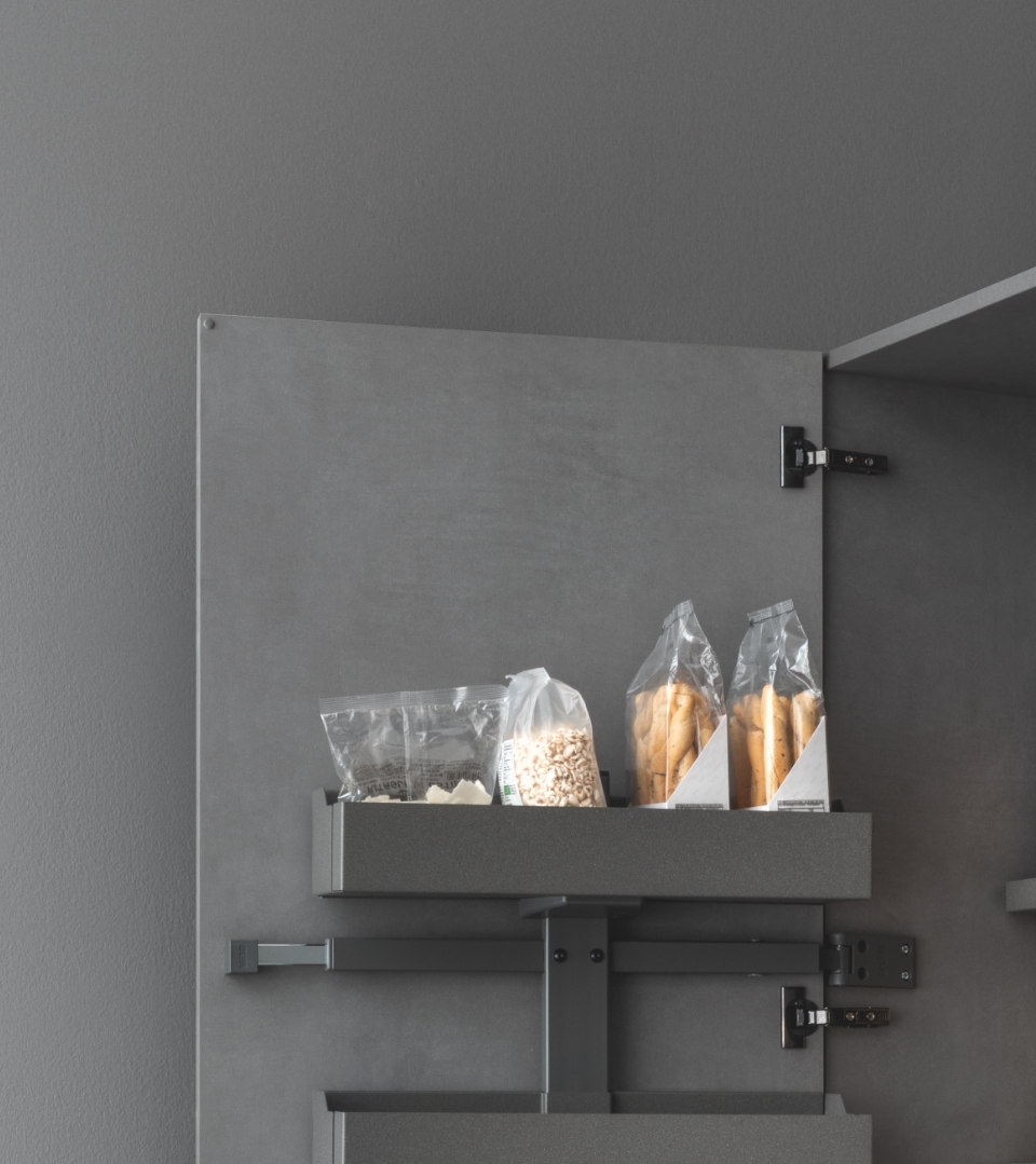 Anche nella variante per sola anta, l’estraibile doppio si conferma un simbolo di ordine e funzionalità in cucina. I cesti della linea Lamina, progettati per essere rimossi con facilità e agevolare una pulizia accurata, sono caratterizzati da profilo e il fondo in lamiera.