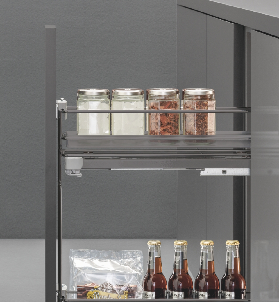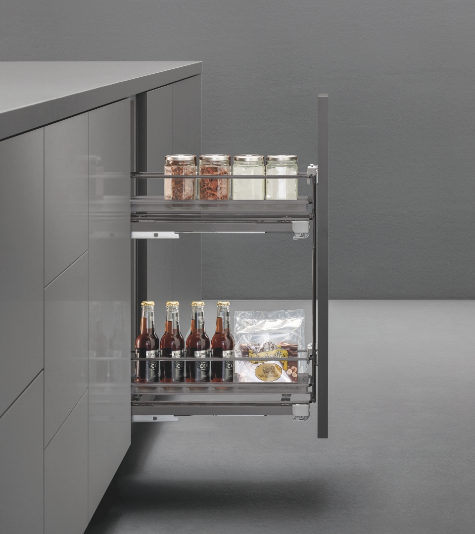 L'estraibile laterale base è la soluzione ideale per ottimizzare anche gli spazi più stretti e angusti della cucina. La presenza di due ripiani in filo tondo con l'aggiunta di una coppia di vaschette in polistirolo satinato offre uno spazio capiente per stoccare diversi prodotti, anche quelli di dimensioni ridotte, senza il rischio che cadano o vengano persi.