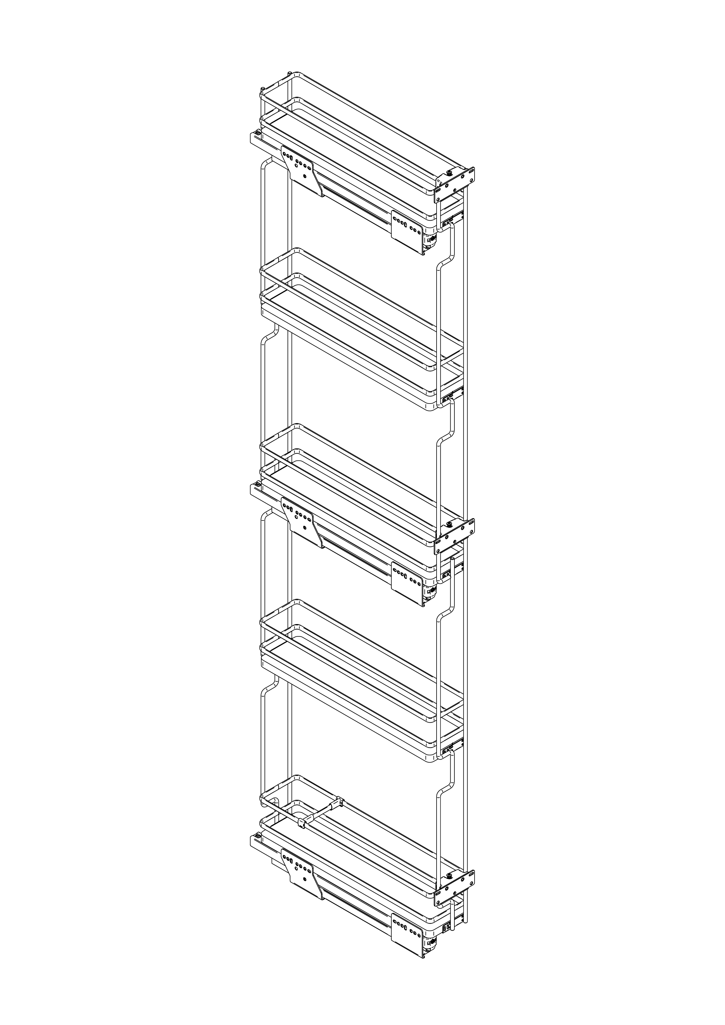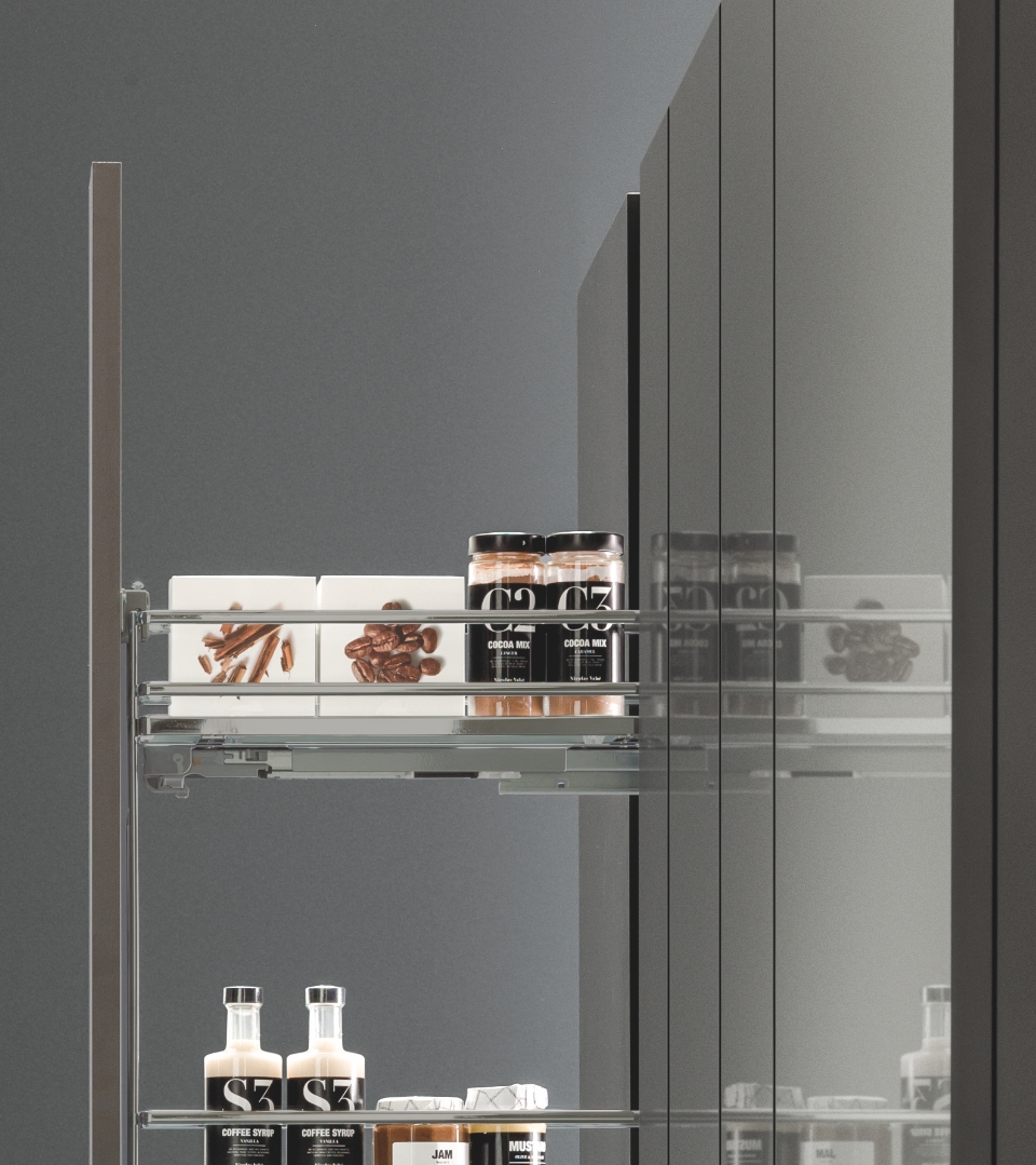 Grazie all'estraibile laterale colonna, con ben cinque ripiani in filo ellittico e fondo in melamina, si è in grado di sfruttare in modo efficiente anche gli spazi più stretti offrendo una completa accessibilità al loro contenuto.
