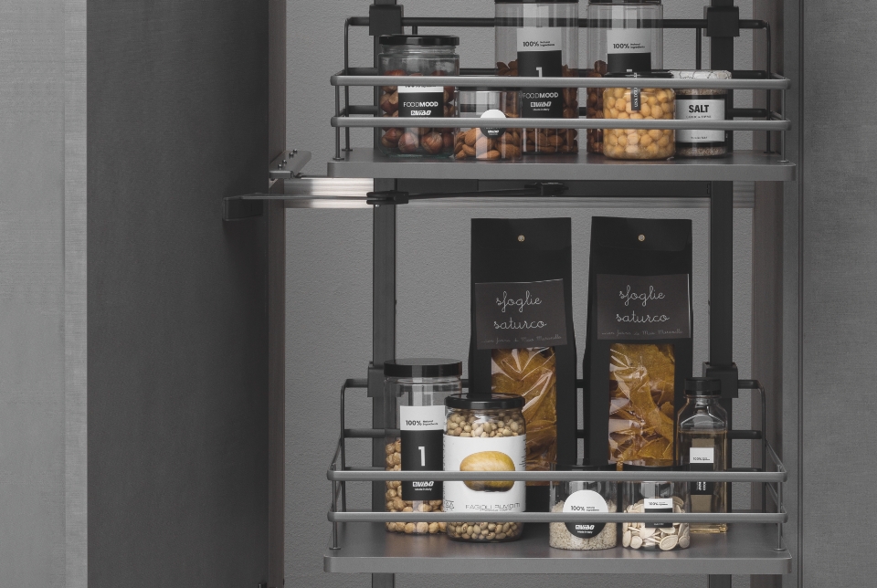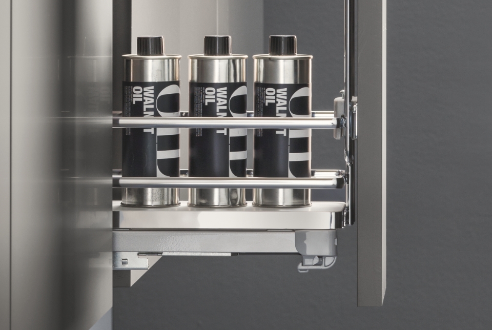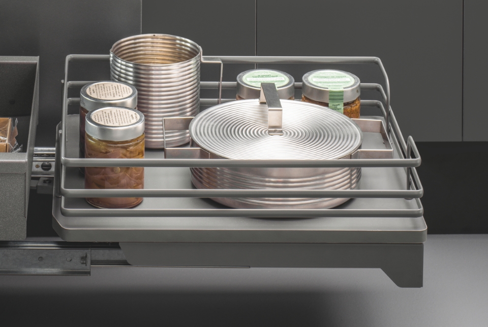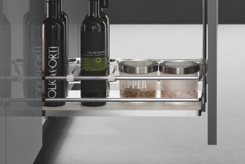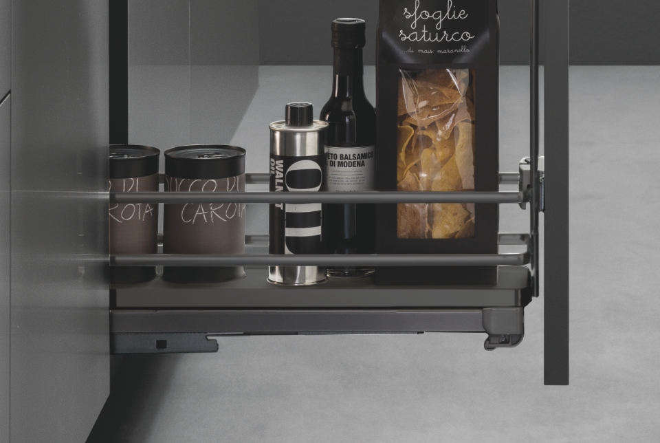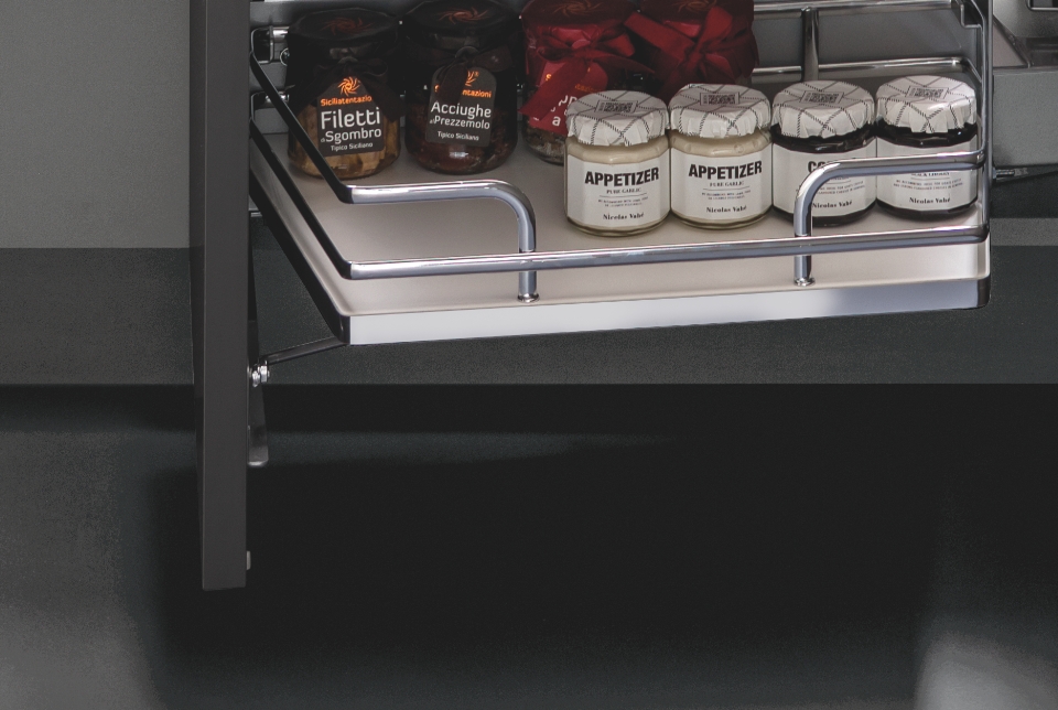 Fly Moon rende accessibile anche gli spazi più nascosti dell'ambiente cucina per poterli sfruttare al massimo e conservare dalle pentole più grandi alle stoviglie. La sua massima versatilità è rappresentata dall'universalità della struttura, la quale è compatibile con i ripiani di altre gamme. In questa versione è disponibile ed incluso il kit per il rientro ammortizzato.