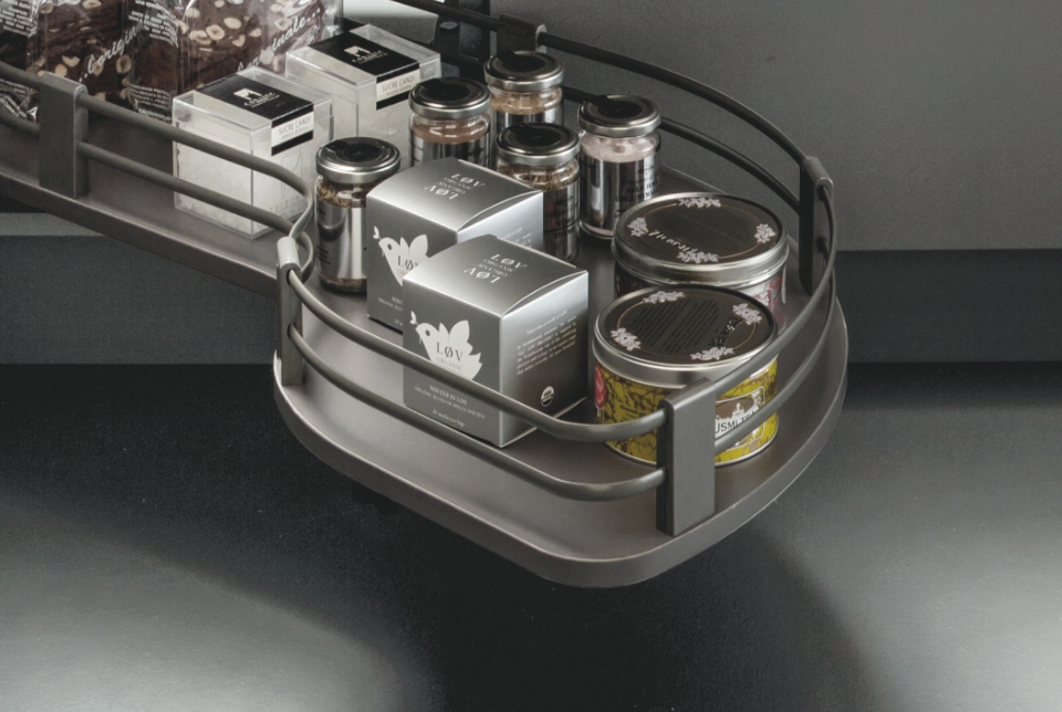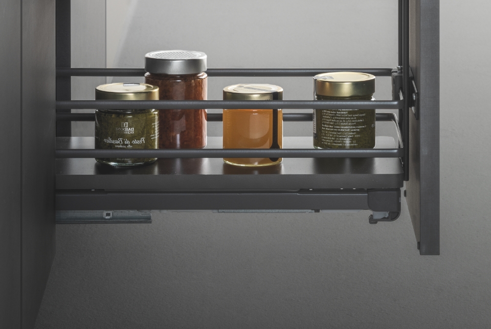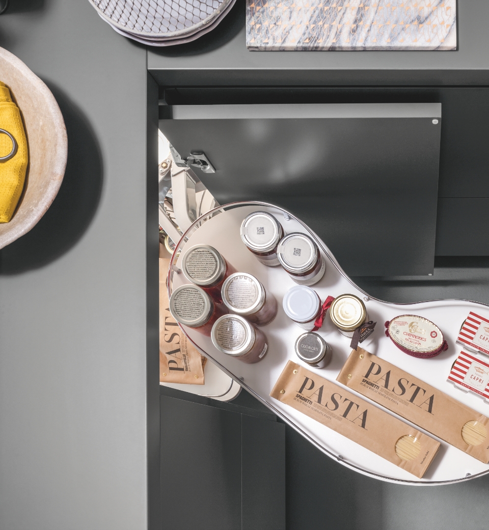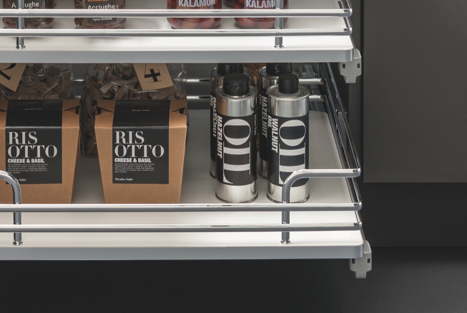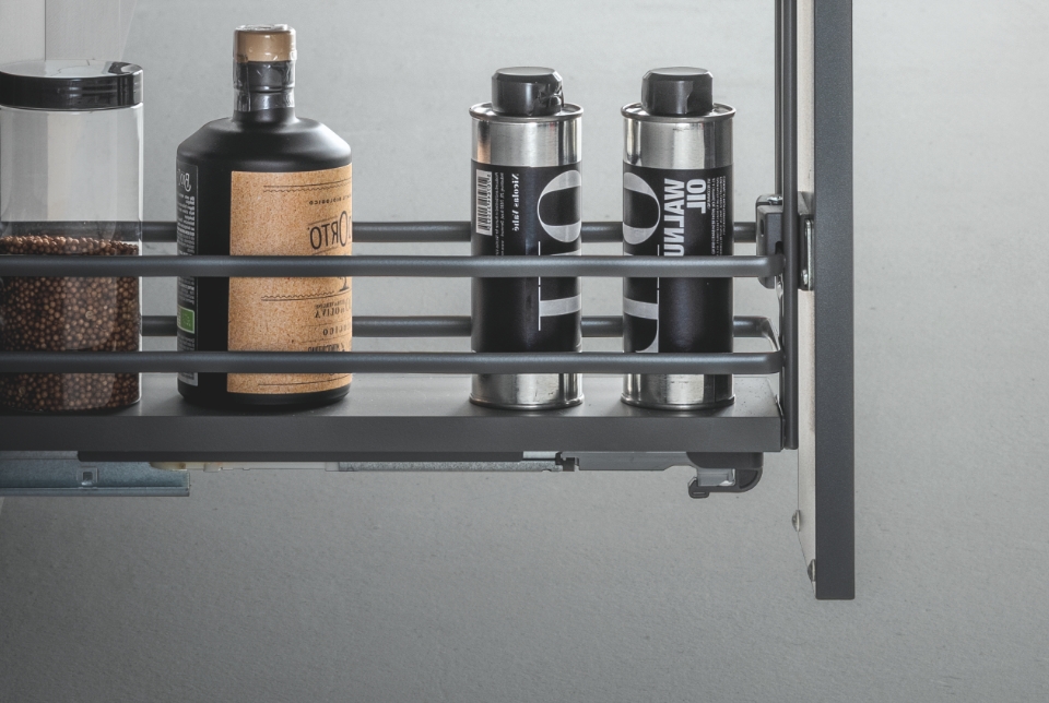 Fly Moon rende accessibile anche gli spazi più nascosti dell'ambiente cucina per poterli sfruttare al massimo e conservare dalle pentole più grandi alle stoviglie. La sua massima versatilità è rappresentata dall'universalità della struttura, la quale è compatibile con i ripiani di altre gamme. In questa versione è disponibile ed incluso il kit per il rientro ammortizzato.