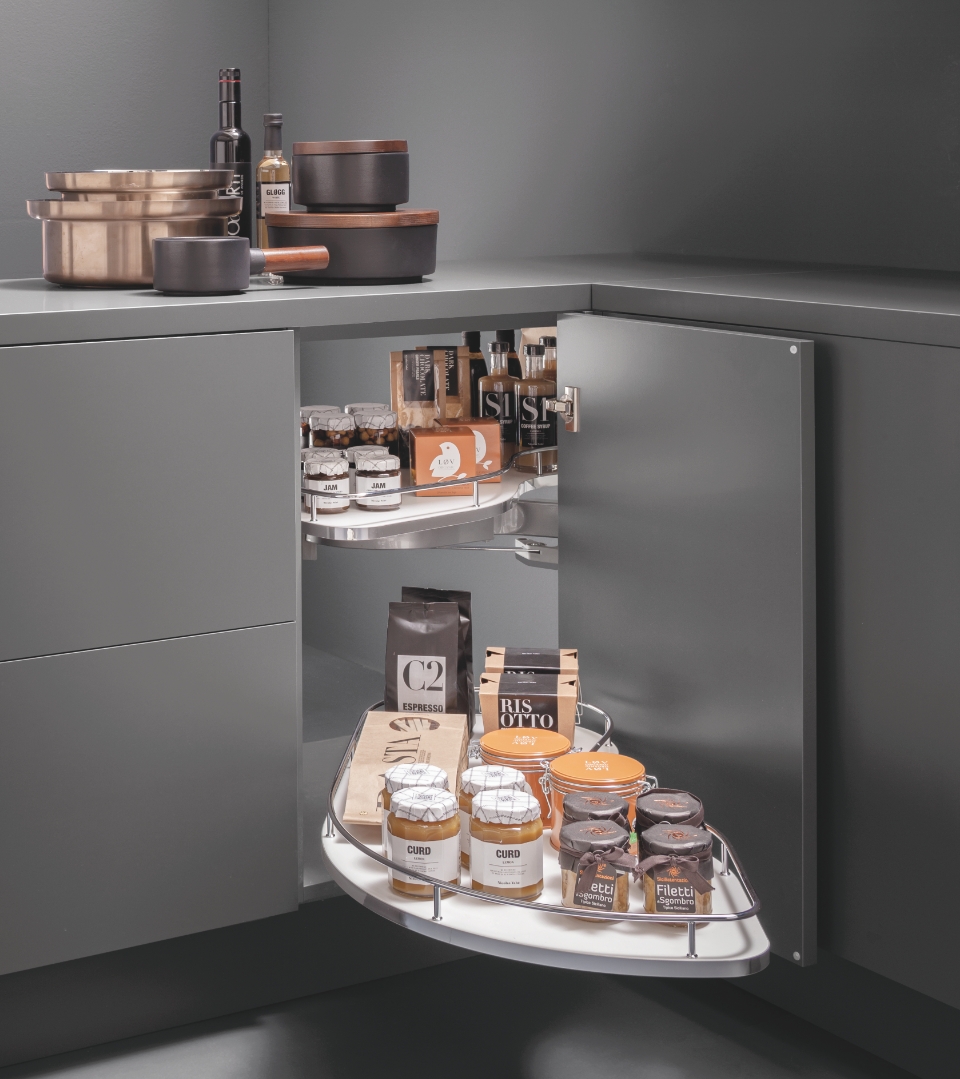 Fly Moon rende accessibile anche gli spazi più nascosti dell'ambiente cucina per poterli sfruttare al massimo e conservare dalle pentole più grandi alle stoviglie. La sua massima versatilità è rappresentata dalla sua struttura universale, compatibile con i ripiani di altre gamme. In questa versione è disponibile ed incluso il kit per il rientro ammortizzato.