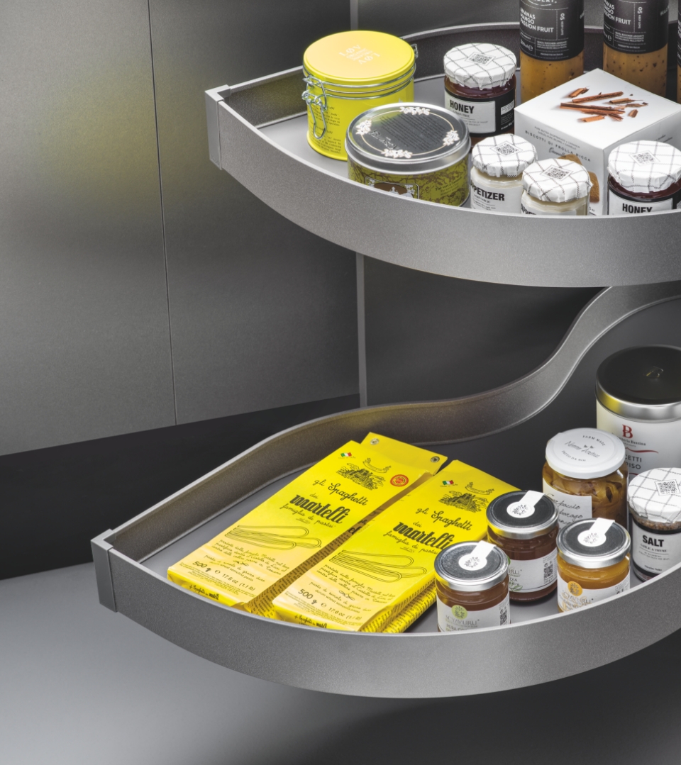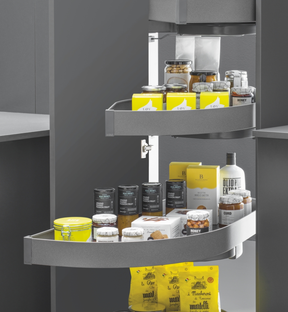 Fly Moon è l'angolo in continua evoluzione. Con i suoi ripiani indipendenti, caratterizzati da profilo in alluminio e fondo in melamina con finitura Galassia, consentono di avere tutto l'occorrente a portata di mano. Fly Moon rende accessibile anche gli spazi più nascosti dell'ambiente cucina per poterli sfruttare al massimo e conservare dalle pentole più grandi alle stoviglie. La sua massima versatilità è rappresentata dall'universalità della struttura, la quale è compatibile con i ripiani di altre gamme. In questa versione è disponibile ma non incluso il kit per il rientro ammortizzato.