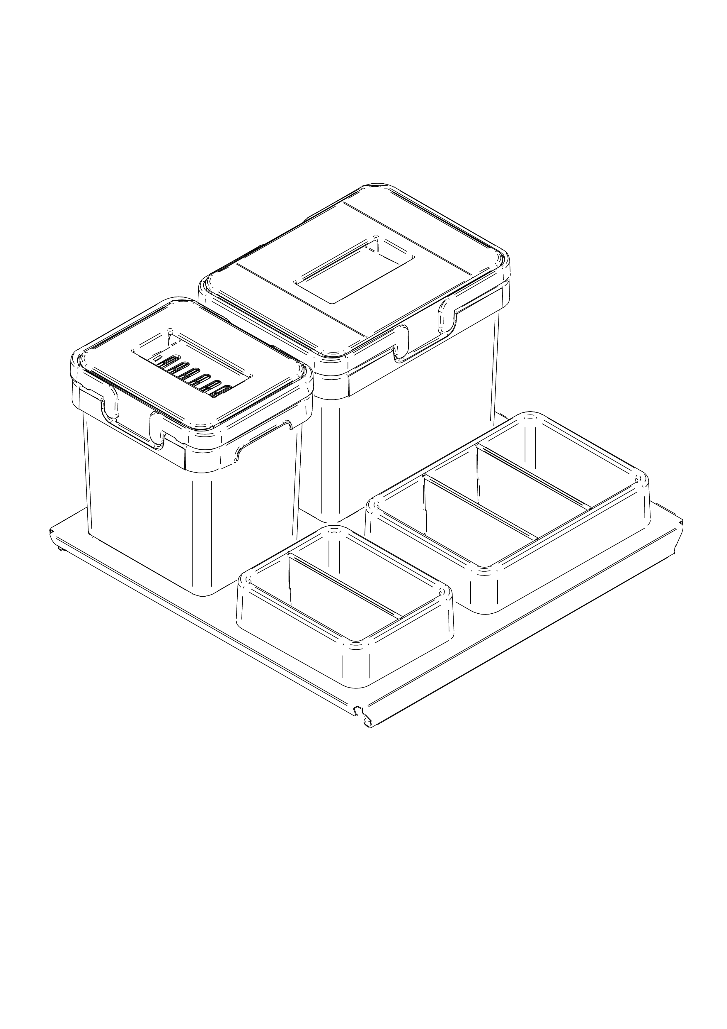 Composto da un basamento in lamiera progettato per essere appoggiato direttamente sul fondo del cassetto, presenta dei fori prespaziati per poter alloggiare le pattumiere in plastica complete di manici per facilitarne l'estrazione.