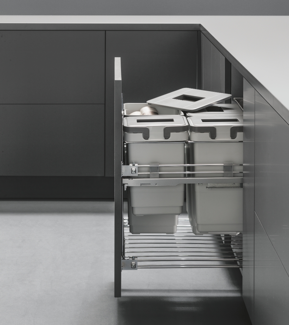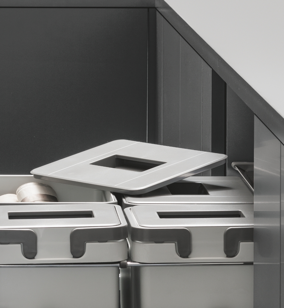 In particolare, il coperchio dedicato alla sezione dell'umido comprende un filtro a carboni attivi e antiodore. La sua versatilità è rappresentata dall'extra estrazione e dalla varietà delle combinazioni offerte che garantiscono la massima personalizzazione e l'ottimizzazione dello spazio all'interno del mobile.
